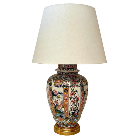 19th Century Delft Vase Converted to Lamp – Tin-Glazed Pottery with Gilt-Wood Base & Textured Shade