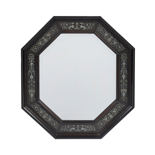 Circa 1880s Italian Ebonized Octagonal Mirror – Inlaid Steel Detailing with Phoenix, Dragons, Masks & Floral Motifs