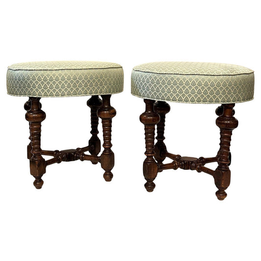 Circa 1880 Pair of Tuscan Hand-Carved Walnut Benches – Italian Stools with Scalamandré Upholstery
