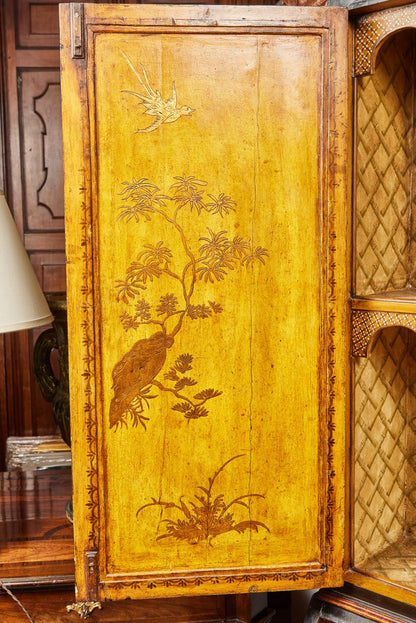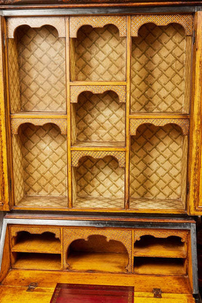 A charming 1940s Chinoiserie secretary from Spain, this petite two-part bureau is hand-painted and lacquered, showcasing vibrant Chinoiserie motifs across a richly finished surface. The drop-front lower cabinet reveals a beautifully detailed writing interior, while the upper doors open to a faux bamboo fretwork wallpapered backdrop with arched, hand-painted niches for added decorative depth.