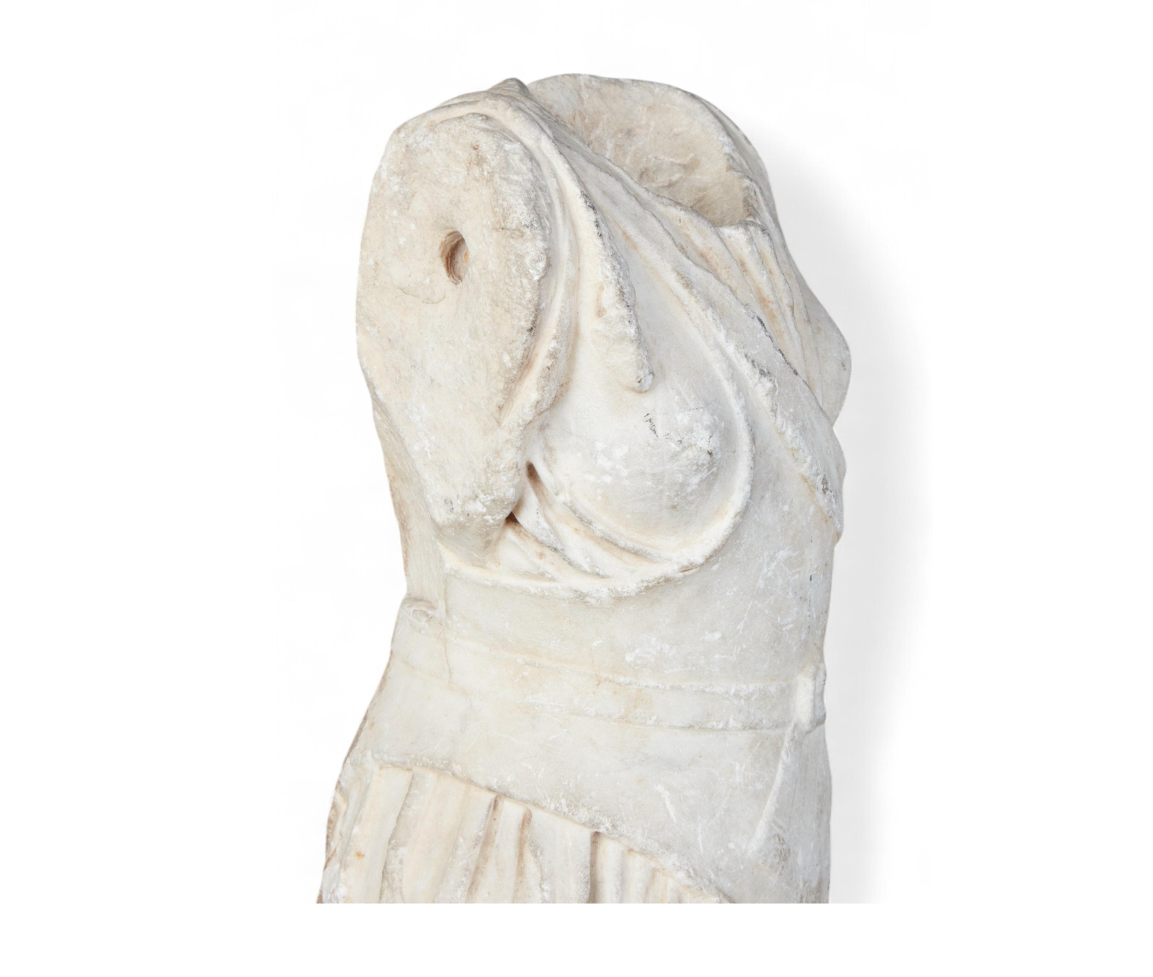 A hand-carved marble torso of Diana from the Roman Imperial era. This genuine fragment – originally sculpted in Italy around the 1st–2nd century C.E. – exudes classical elegance and historical gravitas. Diana, in mythology, embodies the wild and the serene – patron of the hunt, the moon and the natural world. This marble fragment captures the essence of Diana; even though only her torso remains, the sculptural pose and drapery evoke the vitality of Diana on the prowl.
