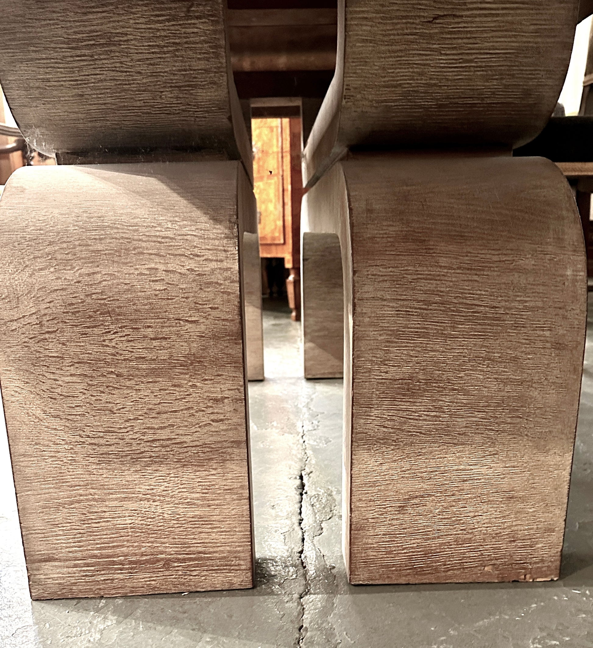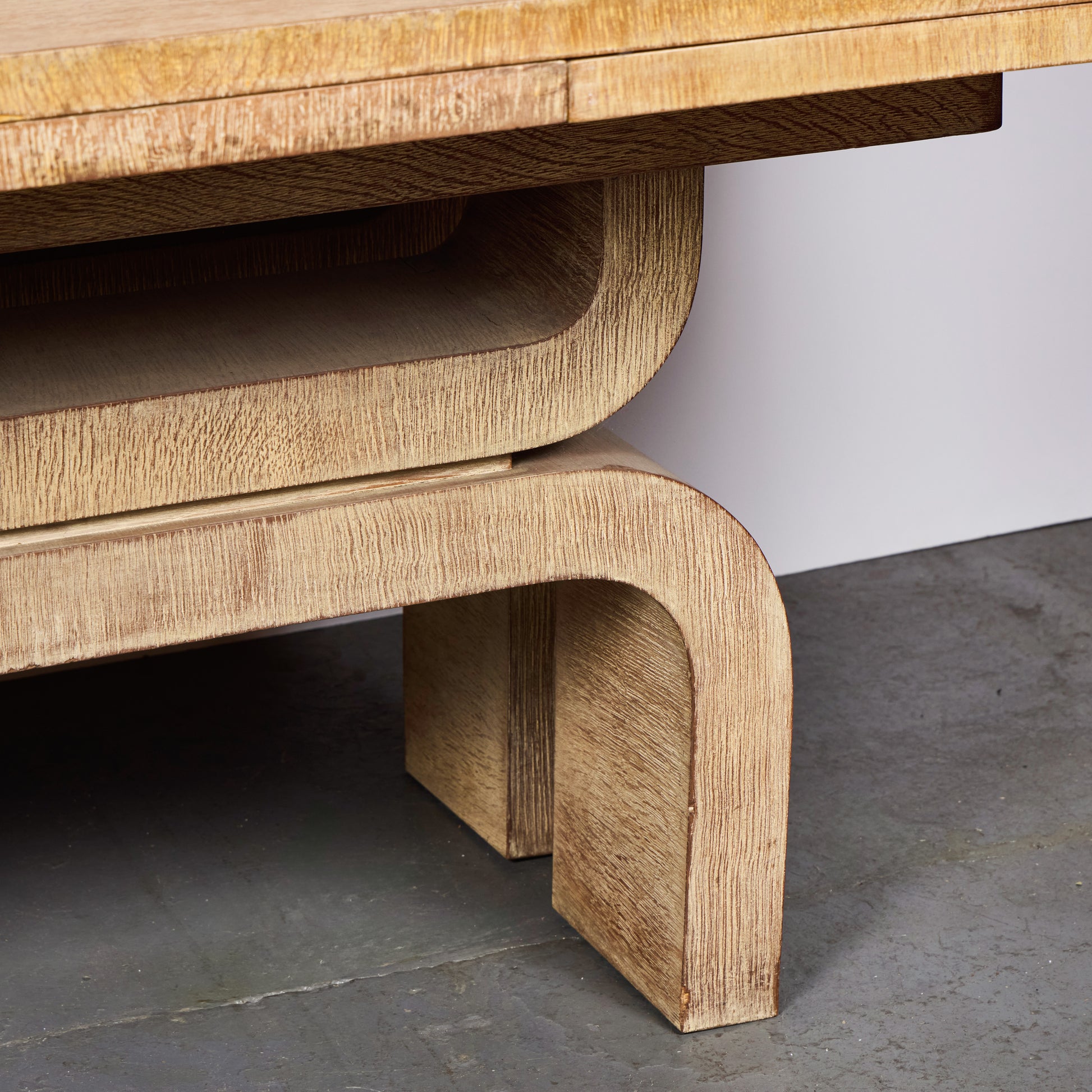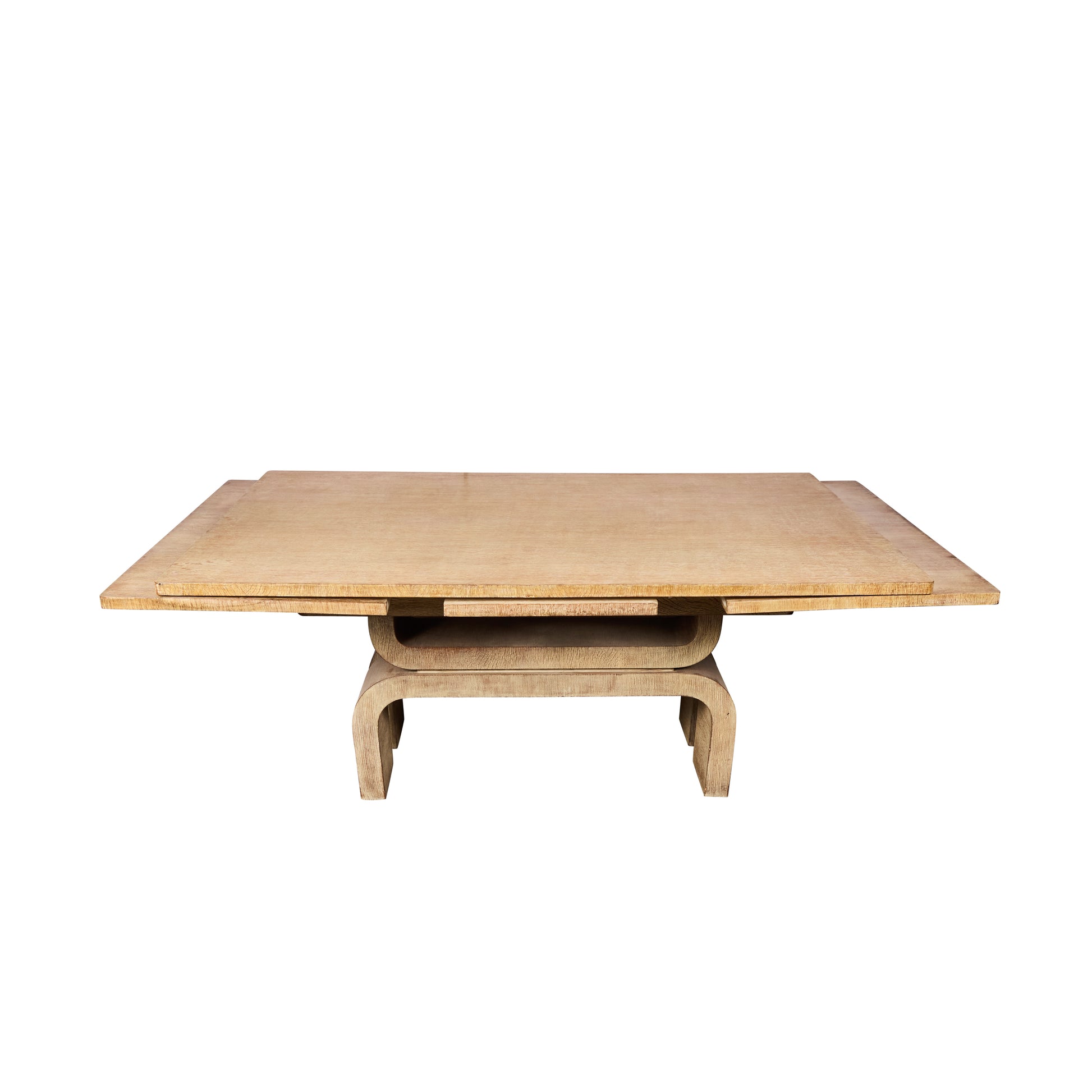 The extension mechanism allows the table to expand to 10’ 1.75”, transforming from an intimate setting to a generous gathering surface while maintaining harmonious proportion. The bleached finish lends a light, contemporary sensibility, while the solid oak construction ensures enduring stability and authenticity.