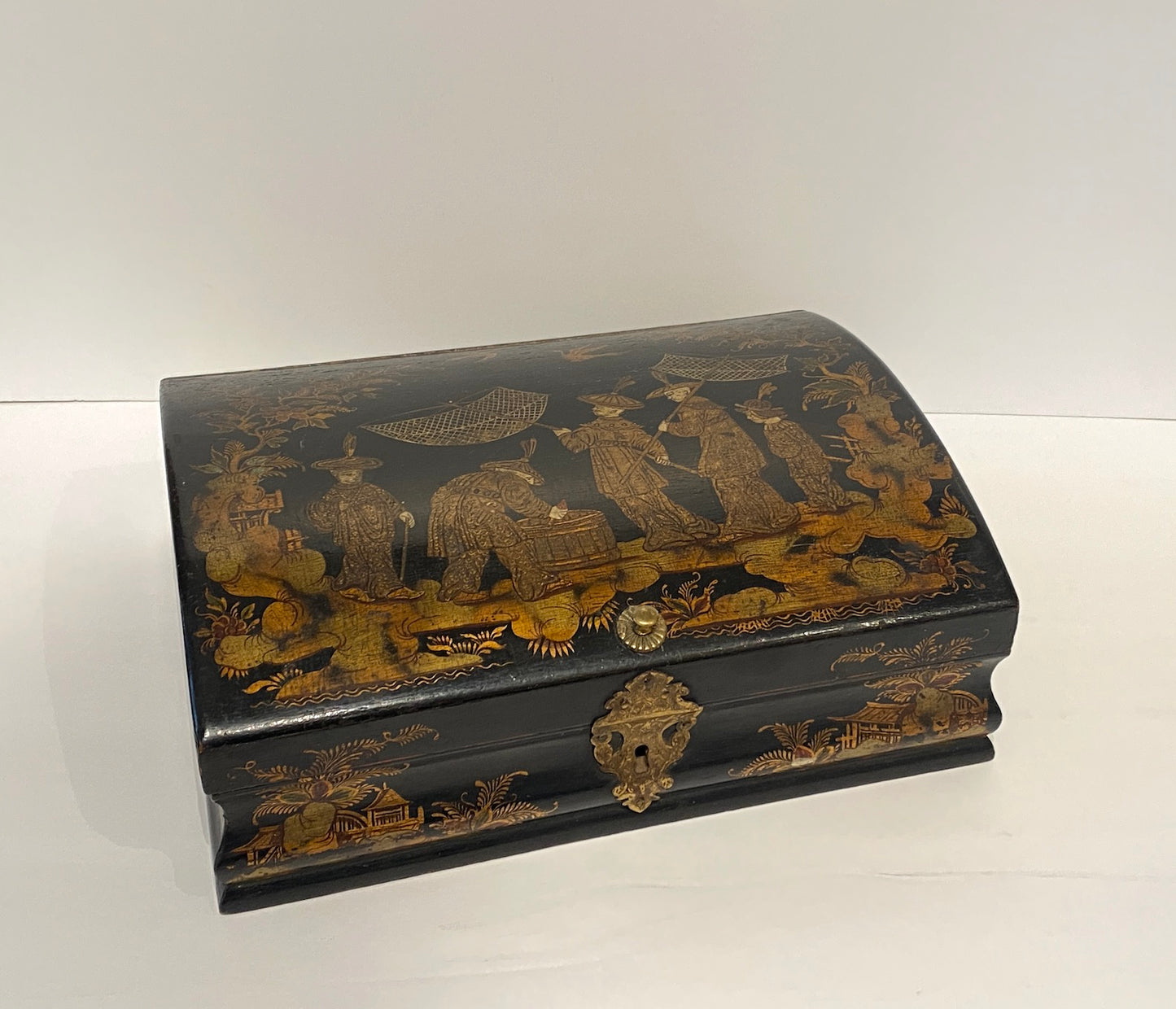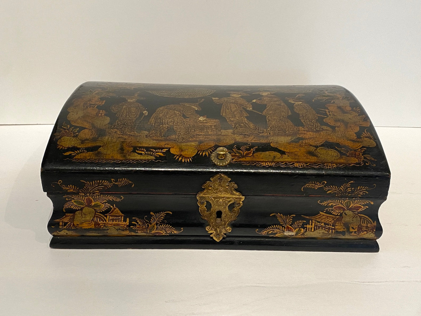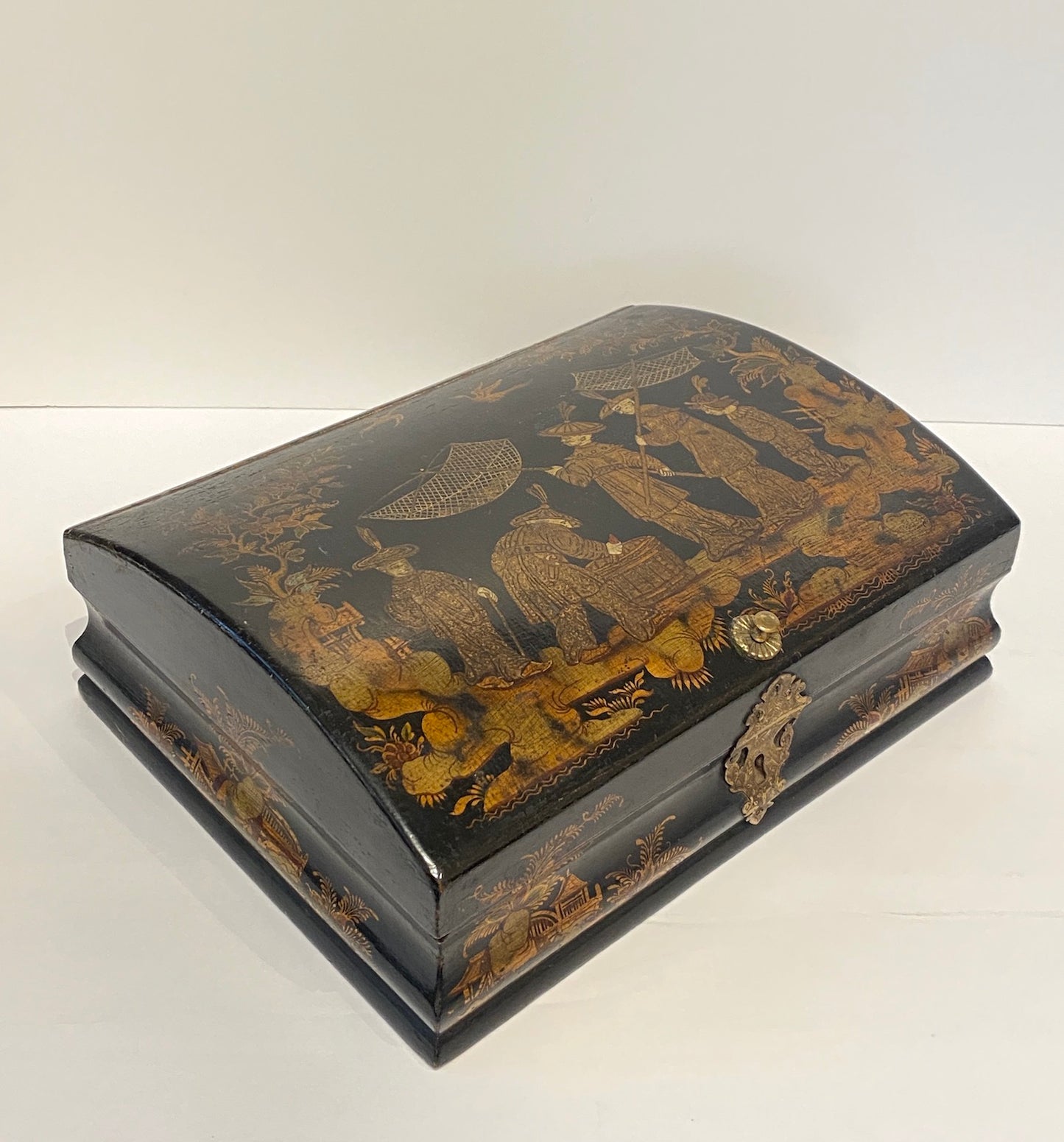 This elegant 19th century French wig box is a finely crafted example of Chinoiserie lacquerware, featuring a gracefully arched, hinged lid and hand-painted figural decoration. The lacquered wood surface is richly adorned with traditional Eastern-inspired motifs, accented by subtle gilding that enhances its historic charm. Original incised brass hardware includes the lock cover, hinges, and a delicately tooled knob.