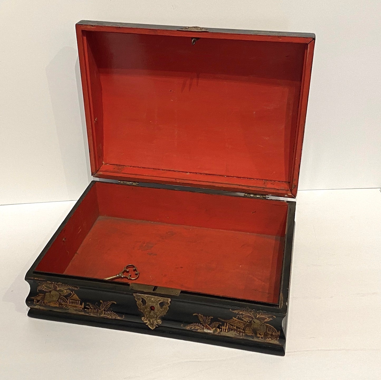 Compact in form yet ornate in detail, this Chinoiserie lacquered box exemplifies the European fascination with the East during the 1800s. Whether displayed on a vanity, writing desk, or console, it adds a touch of exotic sophistication and 19th century French decorative arts to any curated space.