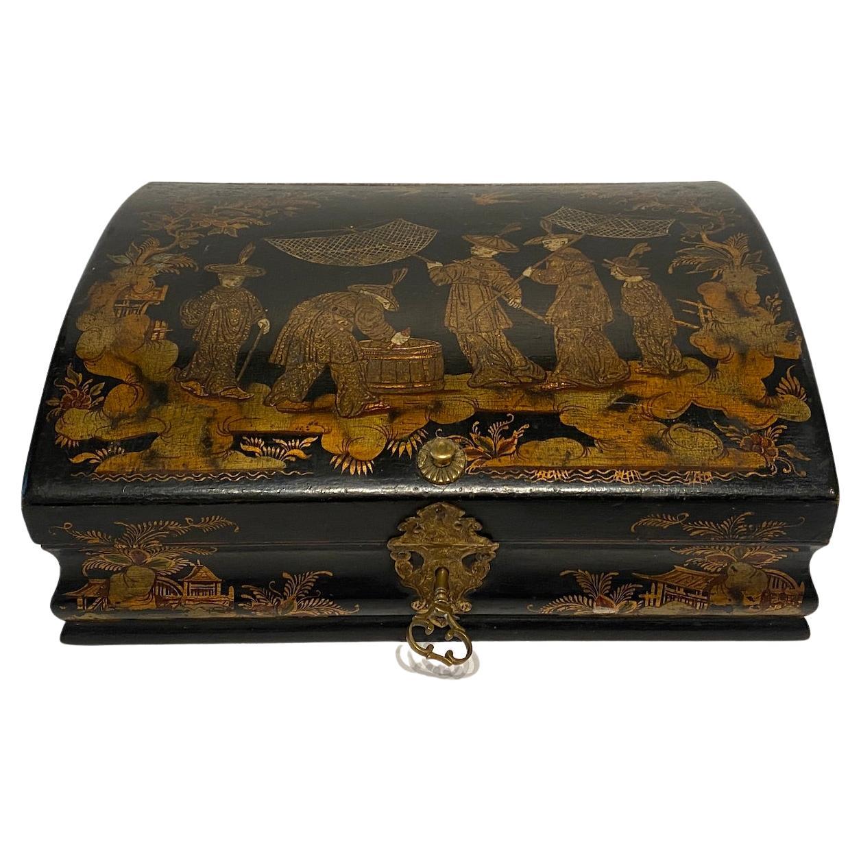 19th Century French Chinoiserie Lacquered Wig Box with Gilded Detailing
