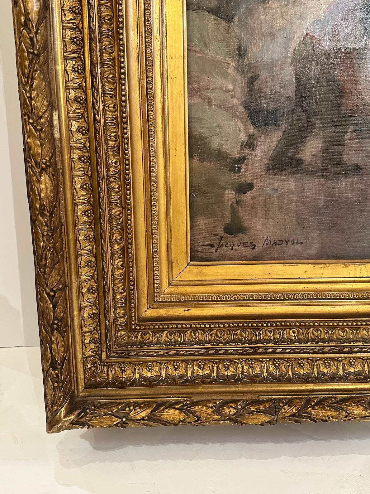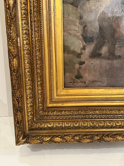 A striking and finely detailed oil on canvas titled “Débardeurs au Travail” by Jacques Madyol (1871–1950), a prominent Belgian artist celebrated for his genre scenes, portraits, and decorative design work. This compelling scene is framed in an ornate, hand-carved gilt-wood frame, emphasizing the classical beauty and historical depth of the composition.
