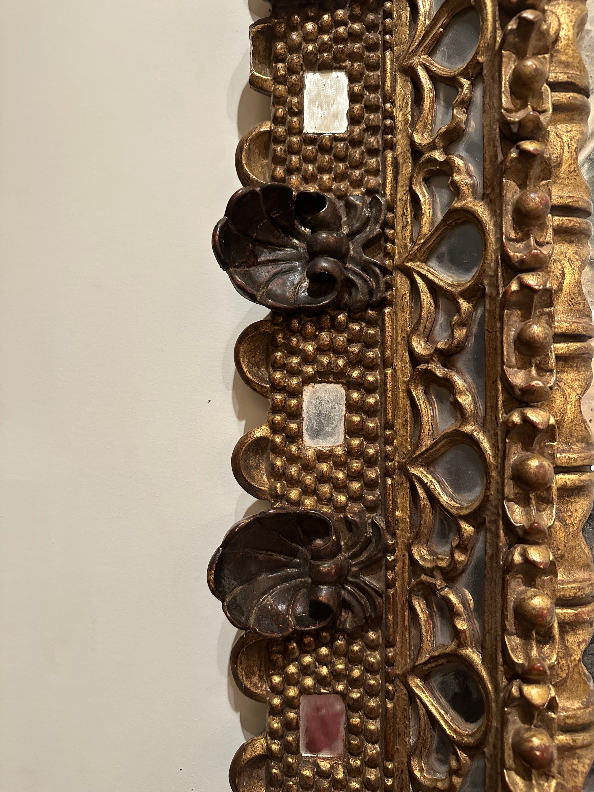 The frame retains its inlaid mirror plates, preserving the layered construction characteristic of period examples. The central mirror glass has been sensitively replaced with new wavy, antiqued glass, intentionally treated with areas of loss to the plating to harmonize with the age and character of the original frame.
