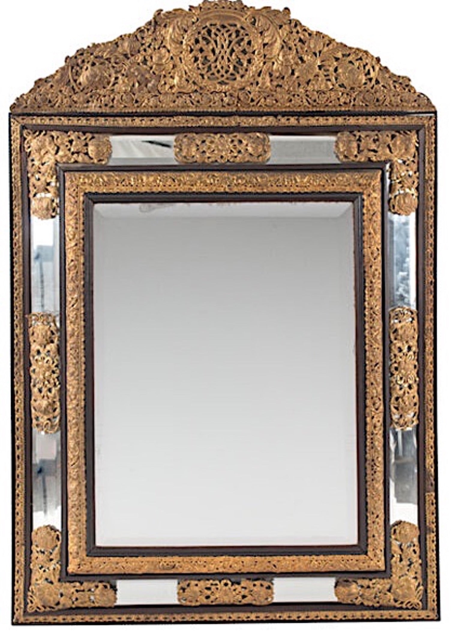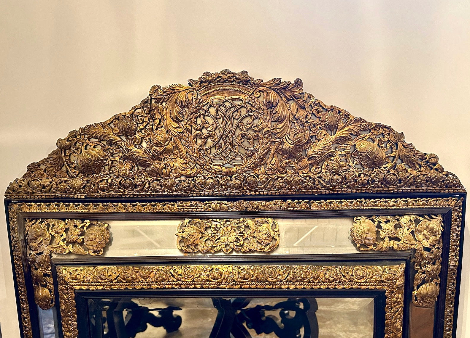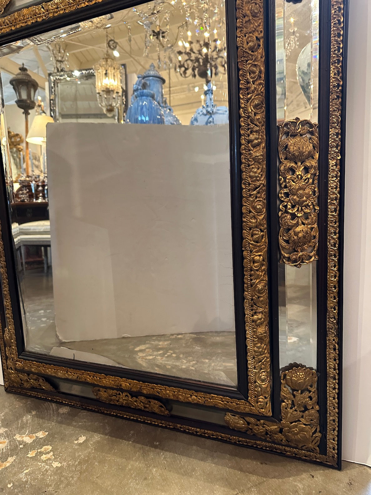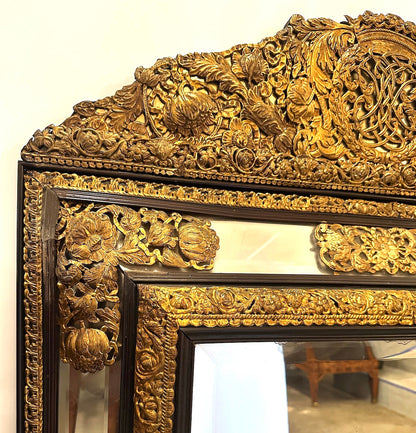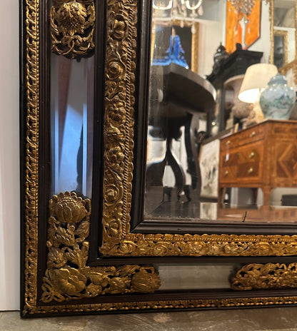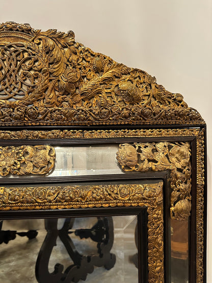 A stunning early 19th century French mirror featuring intricate brass repoussé floral detailing over a solid ebonized wood frame, crowned with an ornate brass crest. The mirror is inset with original beveled diamond dust glass, offering authentic age-related sparkle and reflective charm. This antique wall mirror showcases exceptional craftsmanship and decorative artistry, making it an ideal focal point for classic interiors.