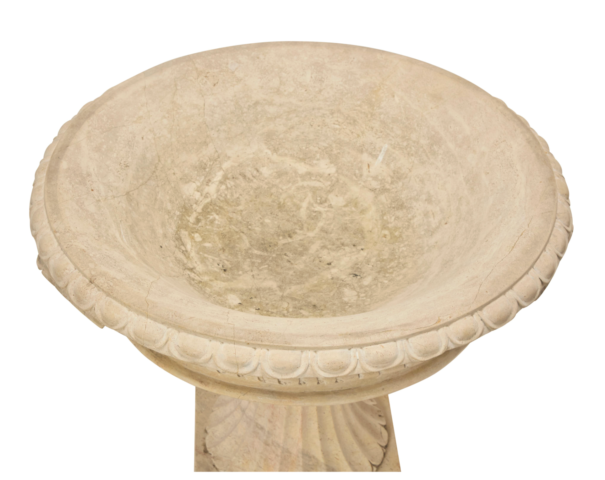 Grand Scale Pair of Hand-Carved Stone Pedestal Urns with Bird Motifs — 20th Century
