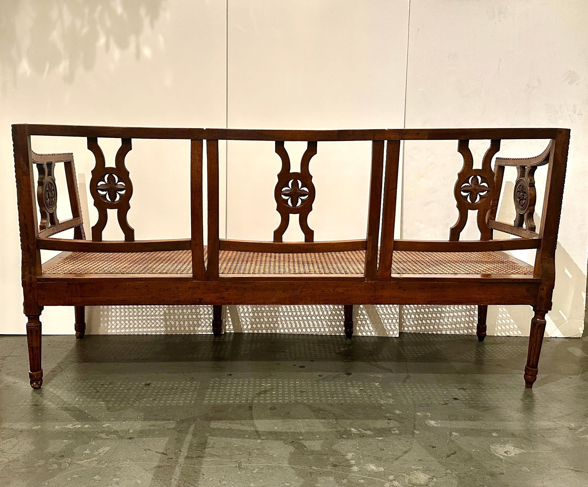 A beautifully hand-carved, walnut, Tuscan 3 seat bench with cane seat.