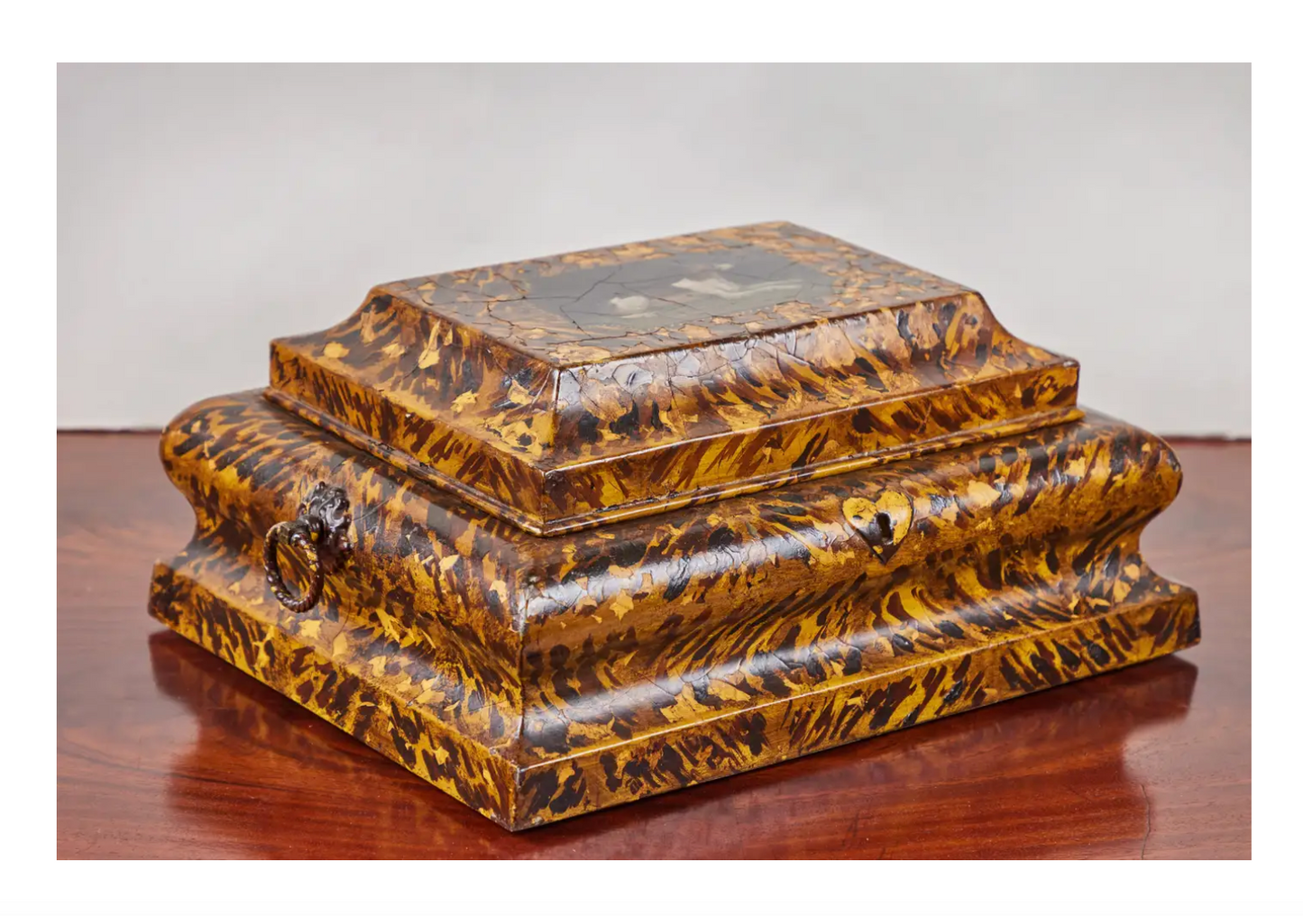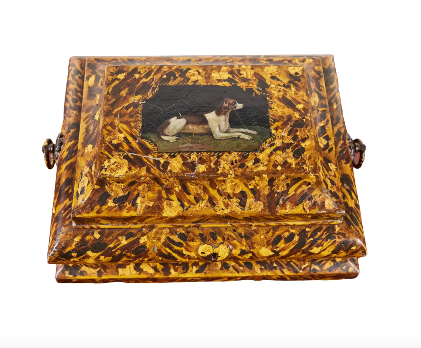 A remarkable example of early 19th-century English craftsmanship, this hand-painted tole letter box features a hinged lid, meticulously finished in faux tortoiseshell. The top is adorned with a charming cameo-style painting of a recumbent hound, framed by a painted rope motif, showcasing both whimsy and elegance.