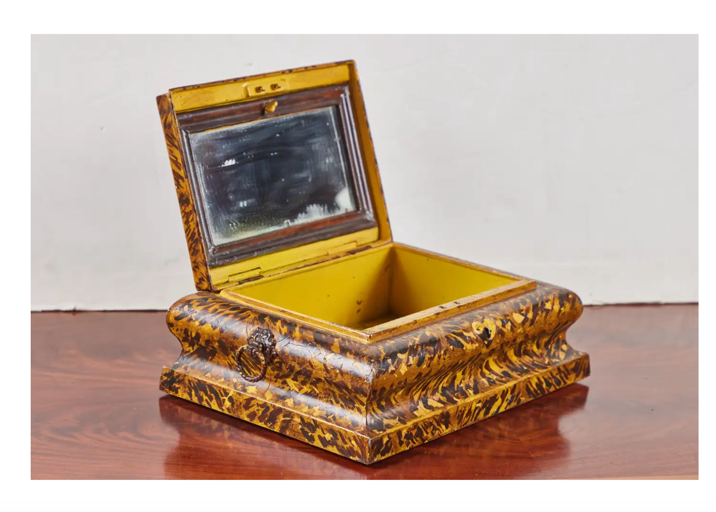 Opening the lid reveals an interior mirror, concealing a secret compartment, adding a delightful layer of intrigue and function.
