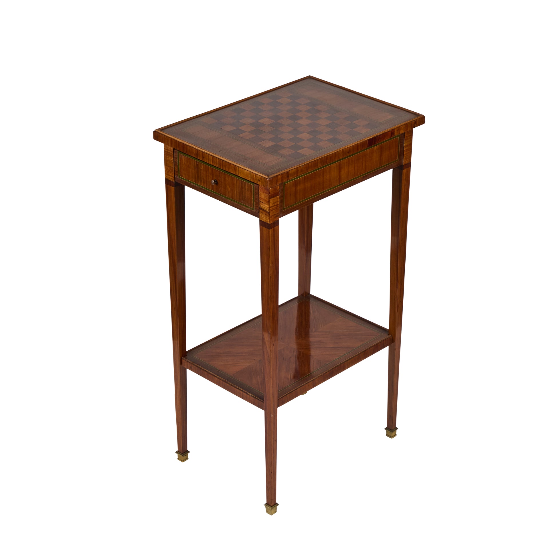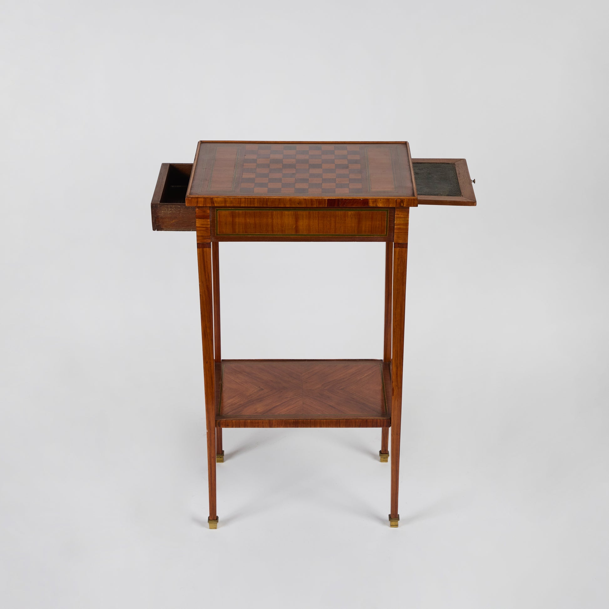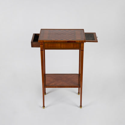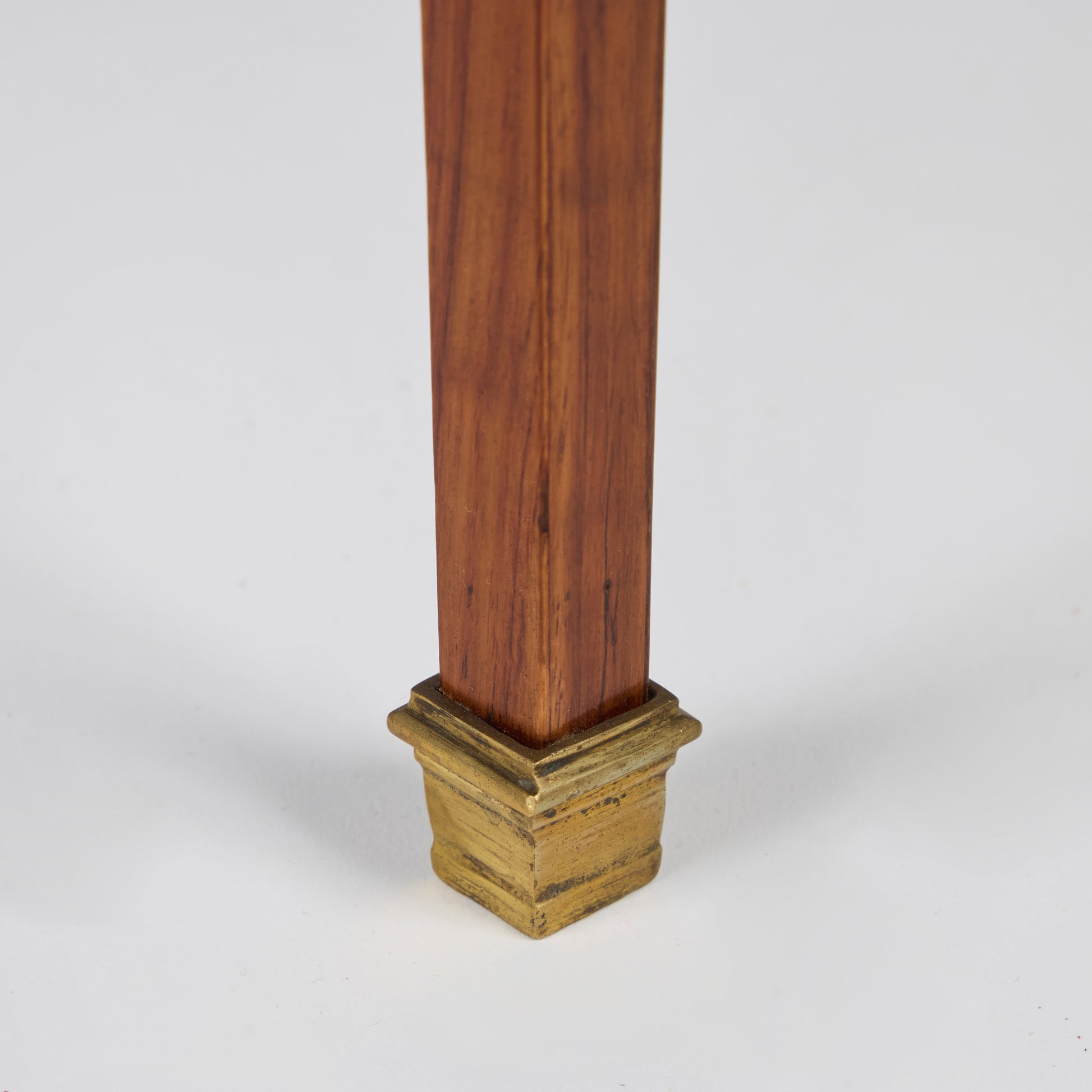 Finishing details such as gilded bronze sabots add a refined, luxurious touch to the table’s tapered legs. Perfect as an accent table, chess or game table, or as a refined companion to a reading chair, this piece brings warmth and decorative charm to any library, study, or living space.