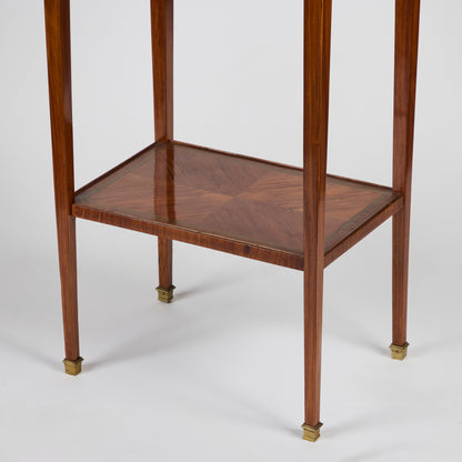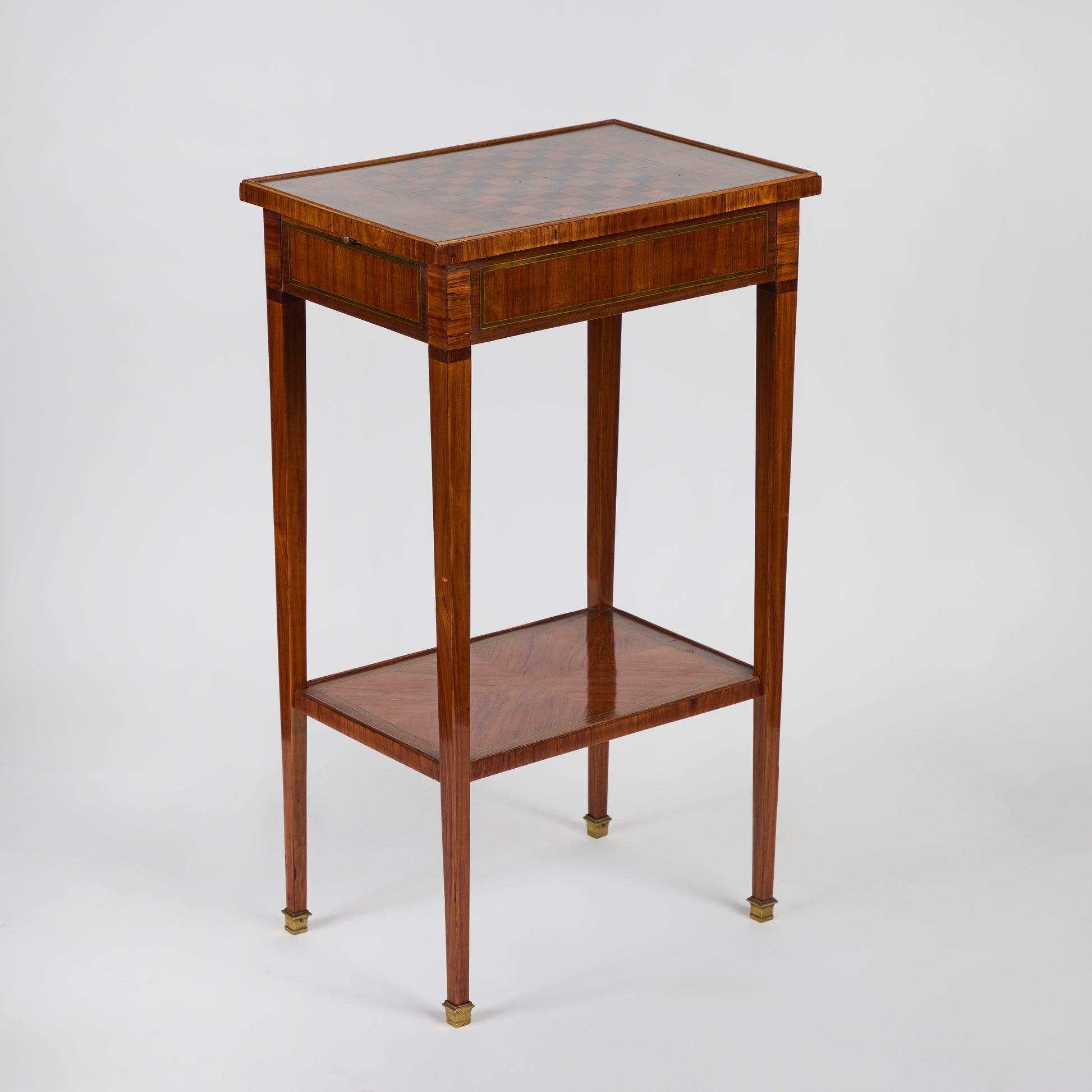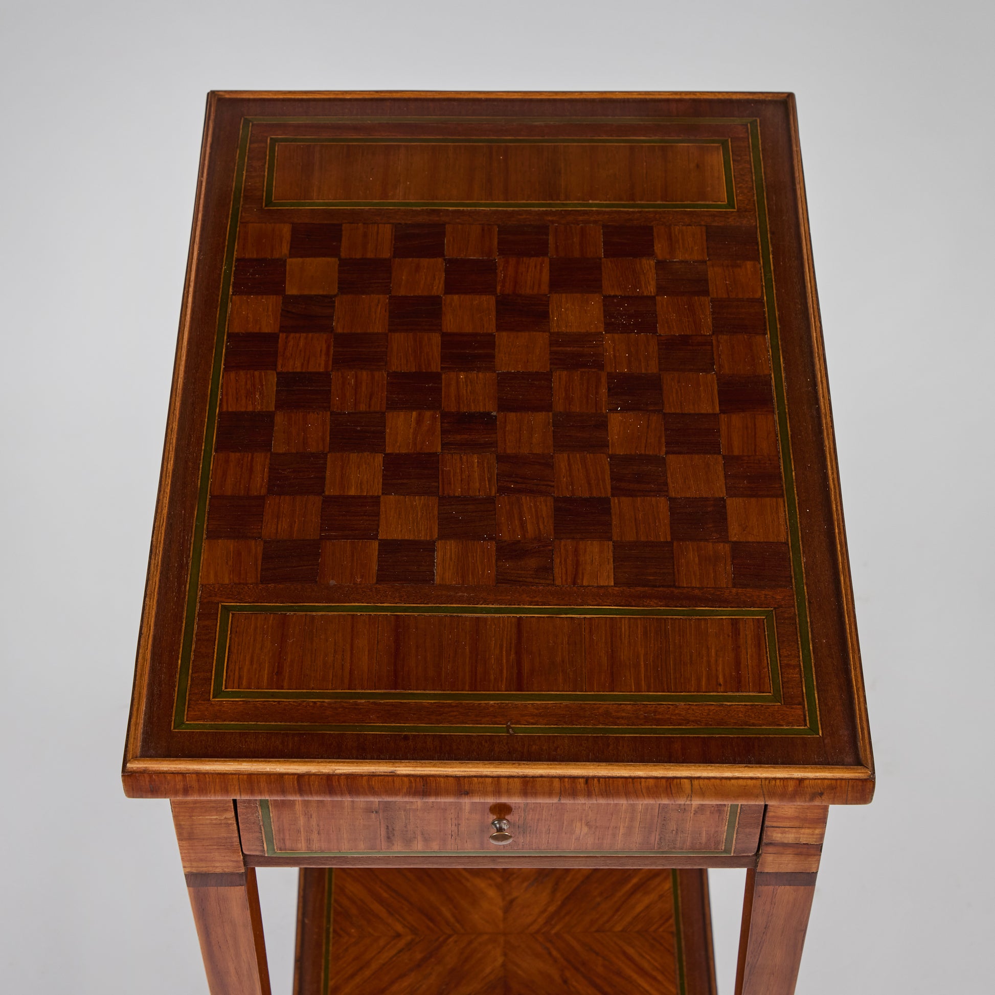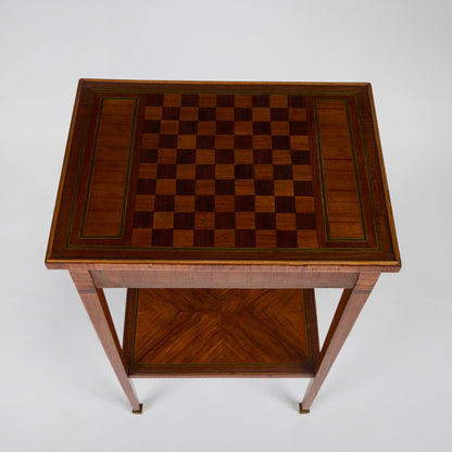 Finishing details such as gilded bronze sabots add a refined, luxurious touch to the table’s tapered legs. Perfect as an accent table, chess or game table, or as a refined companion to a reading chair, this piece brings warmth and decorative charm to any library, study, or living space.