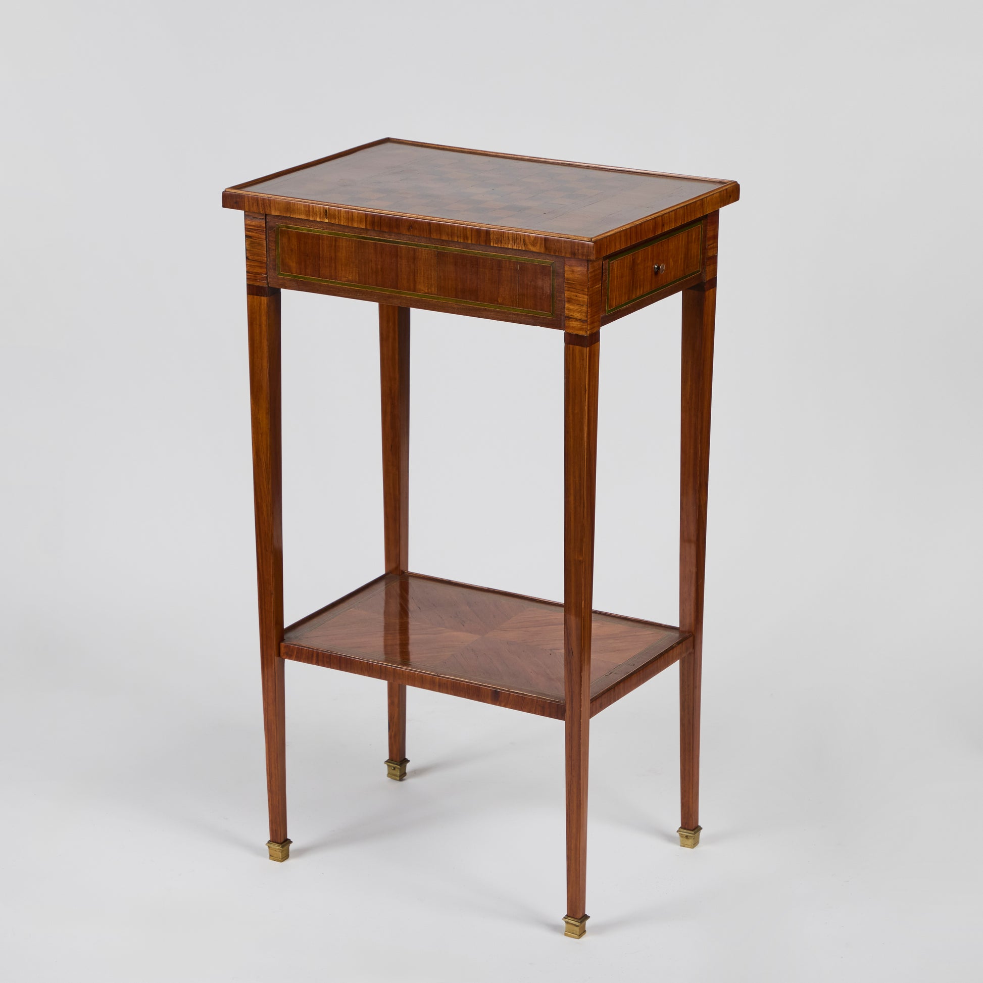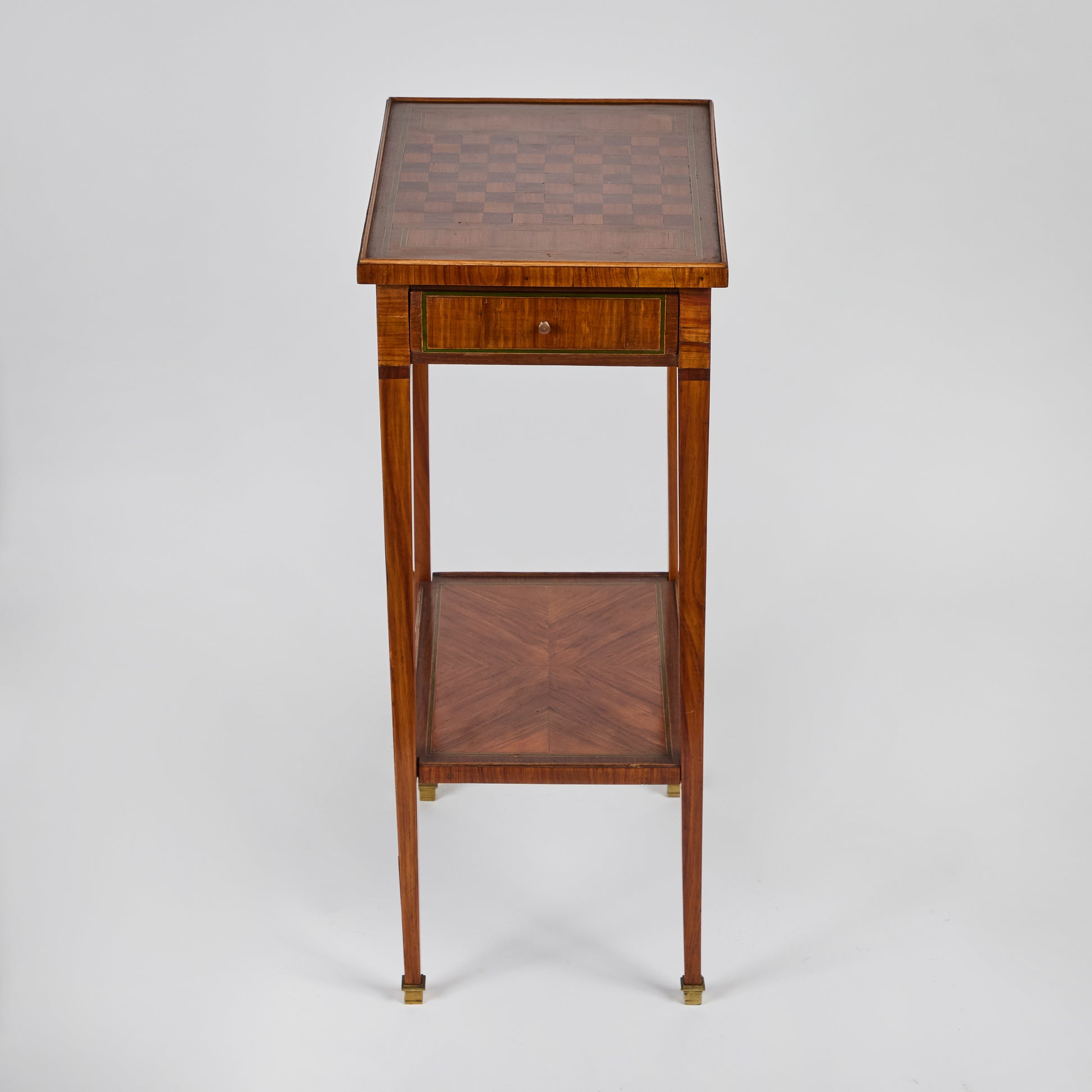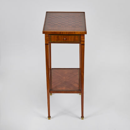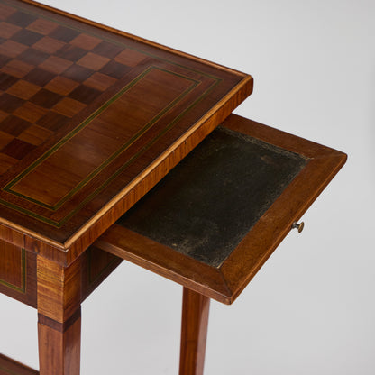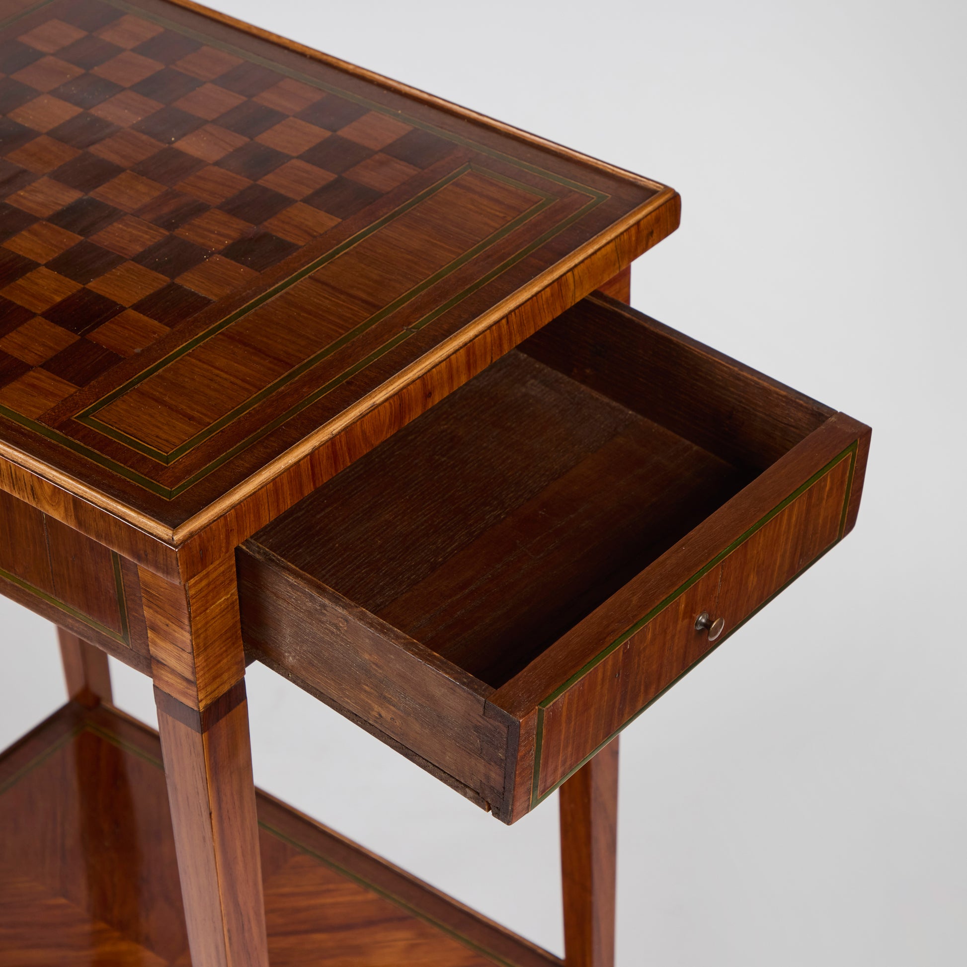 Elegant and functional, this 19th-century Italian side table features a stunning inlaid checkerboard top crafted from burled walnut and poplar, showcasing meticulous craftsmanship and timeless design. The table includes a lower shelf, single drawer, and an inset leather pullout, offering both storage and surface flexibility.