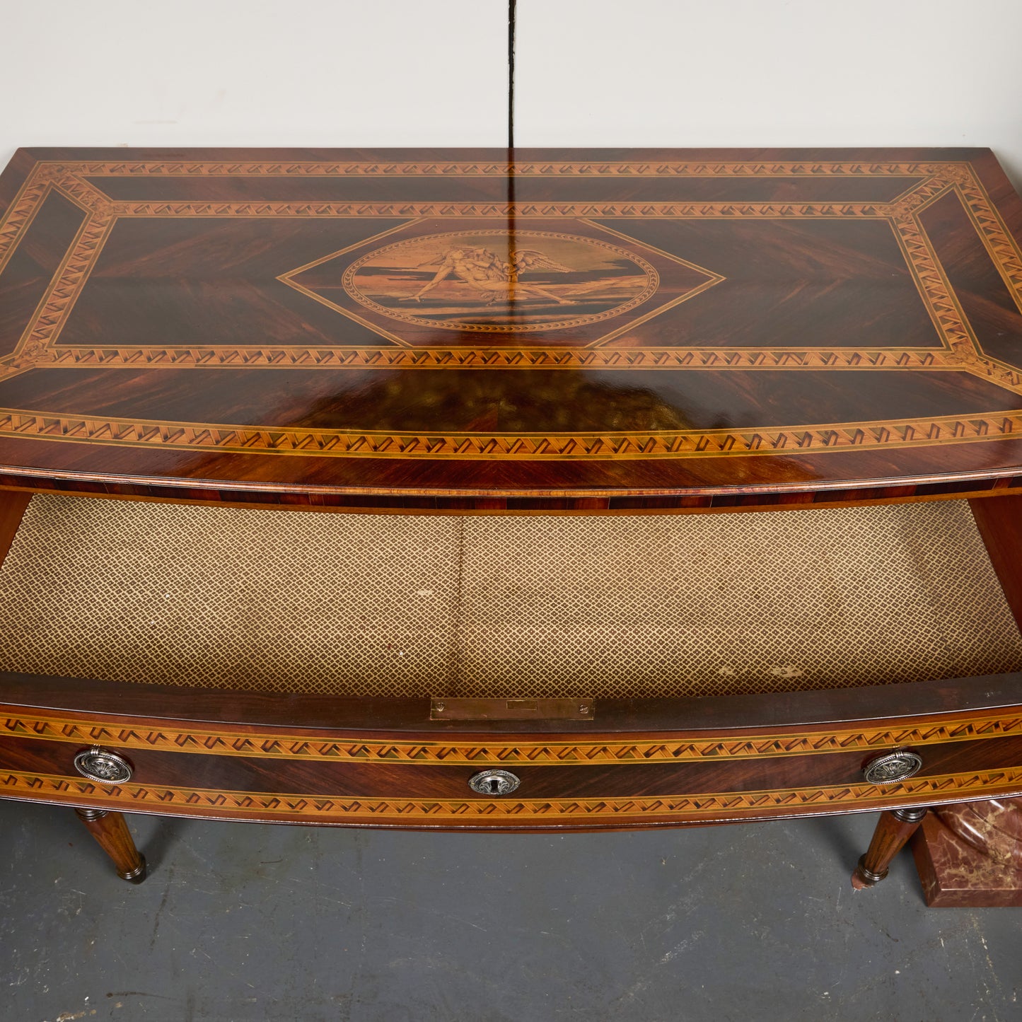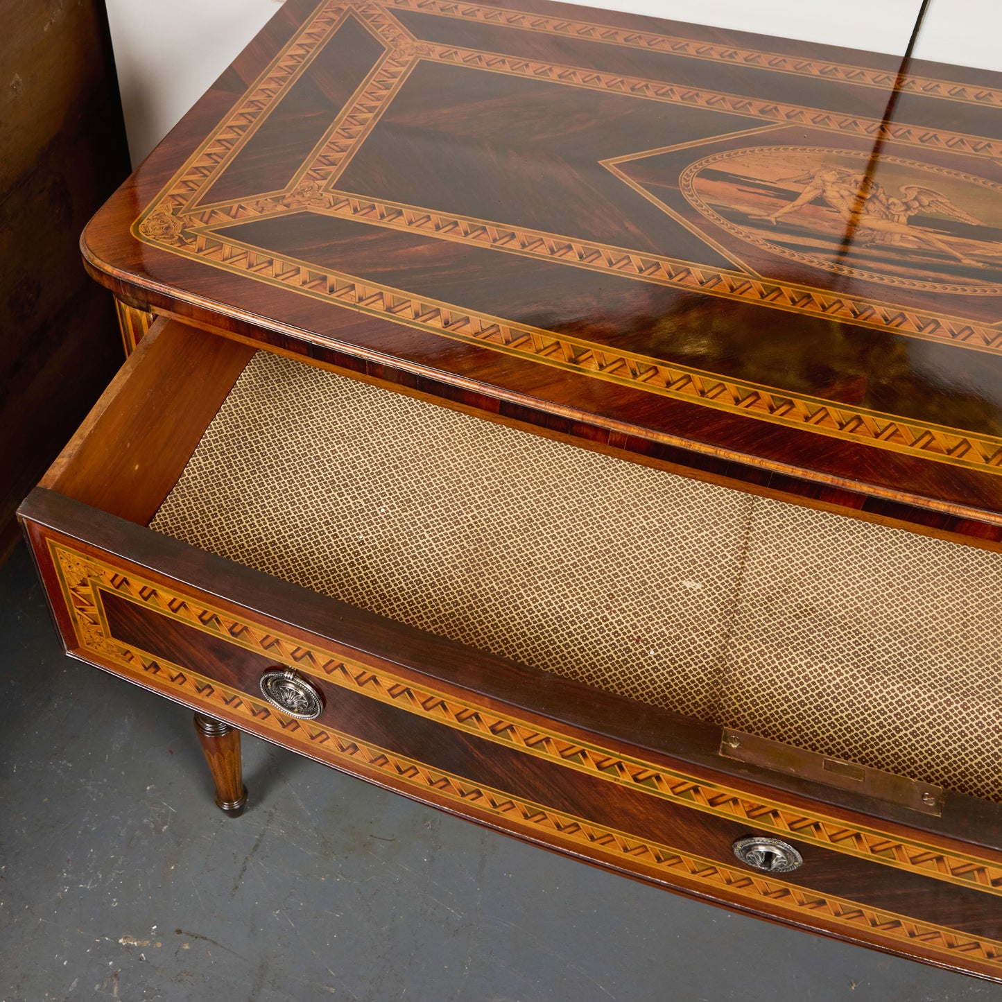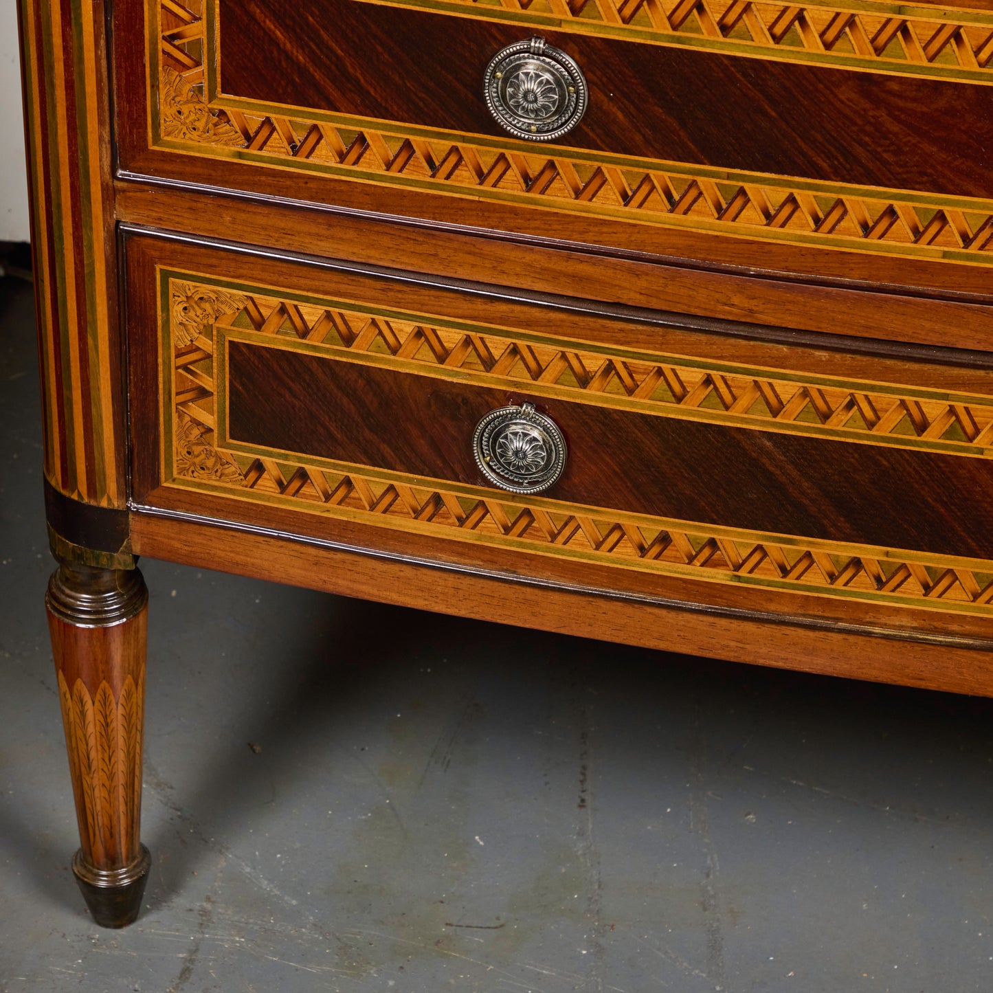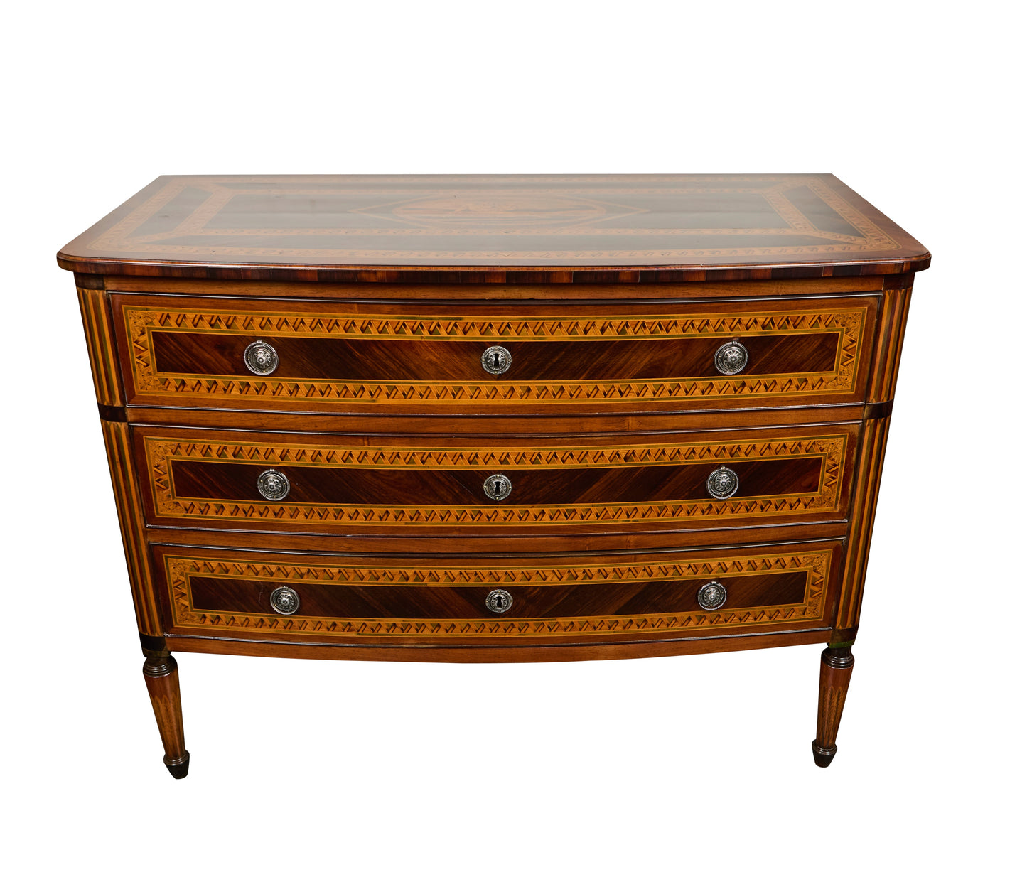 The chest is further enhanced by silver-gilded metal hardware, with sunflower-shaped escutcheons and ring pulls, adding a luminous contrast to the warm wood tones. With its serpentine front, finely carved details, and elegant proportions, this piece exemplifies Italian neoclassical design at its finest.