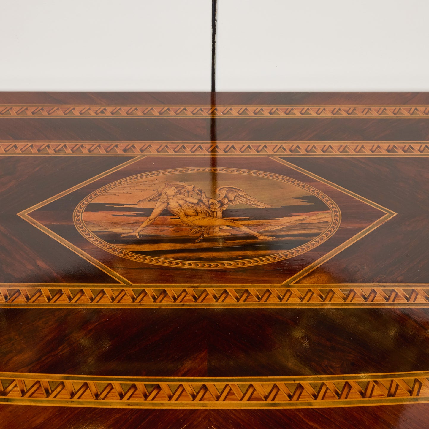 Exquisite in craftsmanship and rich in historical detail, this circa 1780 inlaid chest of drawers originates from the Piedmont region of Italy, a center of fine cabinetmaking in the 18th century. Constructed from walnut and pecan wood, this stunning 3-drawer commode features intricate inlay work and a central allegorical motif adorning the top—highlighting both artistry and symbolism.