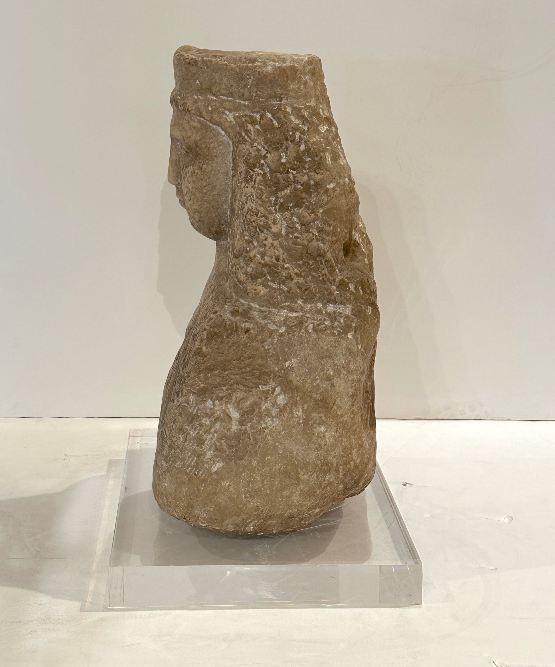 Now resting on a separate, modern Lucite base, the historic fragment is presented with clarity and balance, creating a dialogue between ancient craftsmanship and contemporary display. The contrast highlights the enduring elegance of the sculpture, allowing it to function equally as an archaeological artifact and a refined sculptural centerpiece within a curated interior.