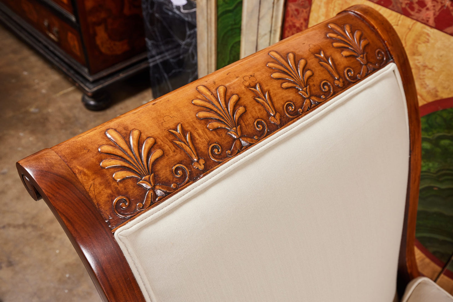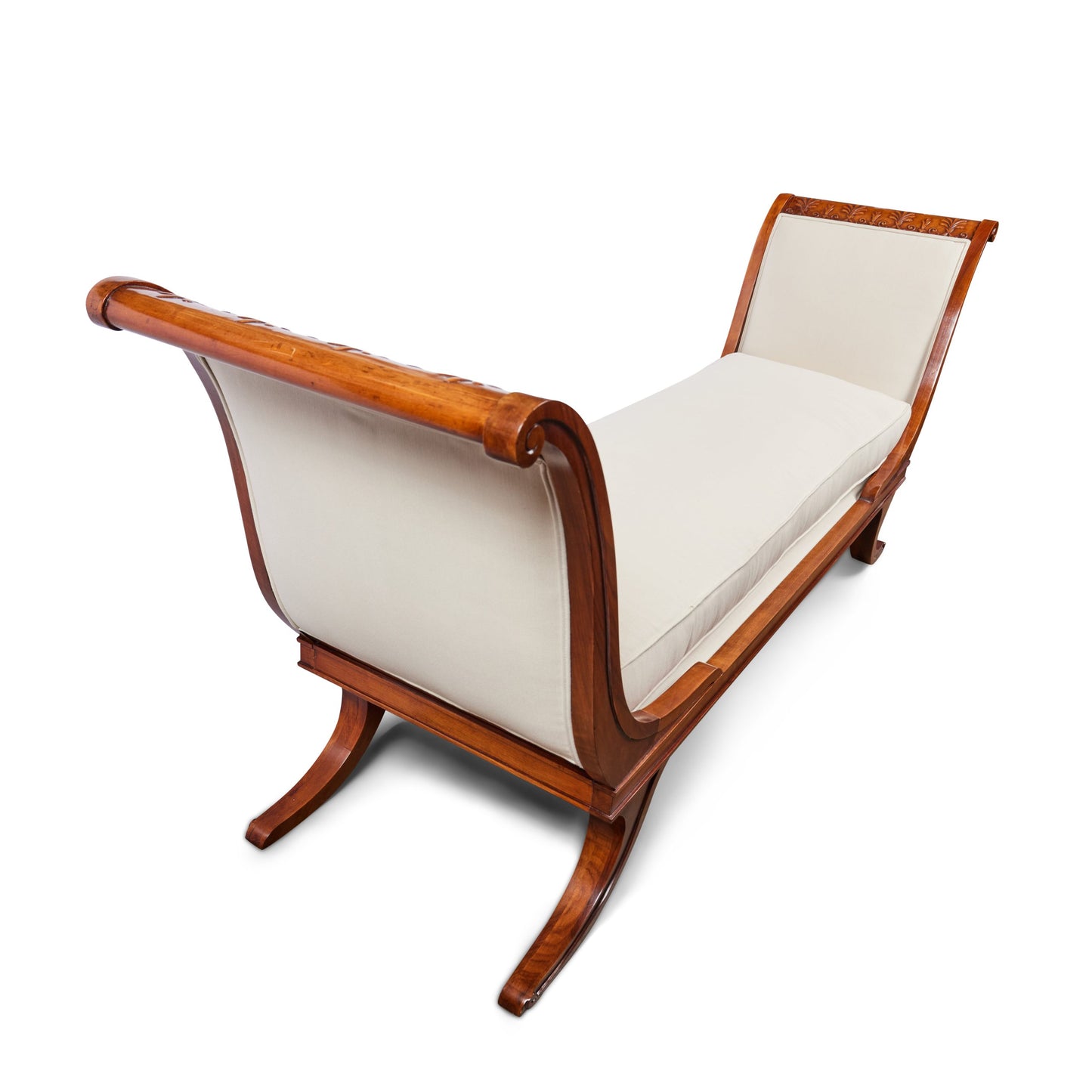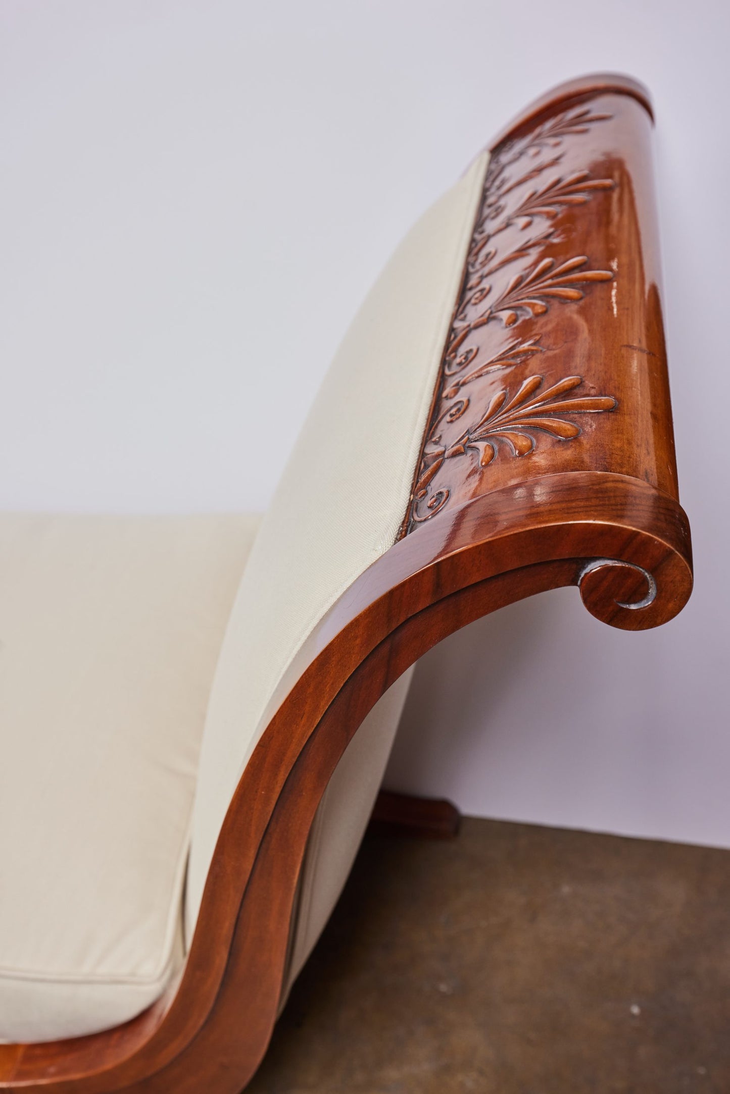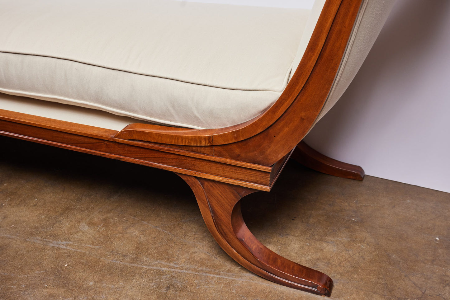 Now newly upholstered in a neutral cream linen, the divan includes a custom cushion for added comfort while preserving its antique integrity. The graceful silhouette and elongated form make it an ideal statement piece for a formal living room, grand hallway, or bedroom sitting area. Its combination of ornate woodwork and updated textile elements allows it to complement both traditional and transitional interiors.