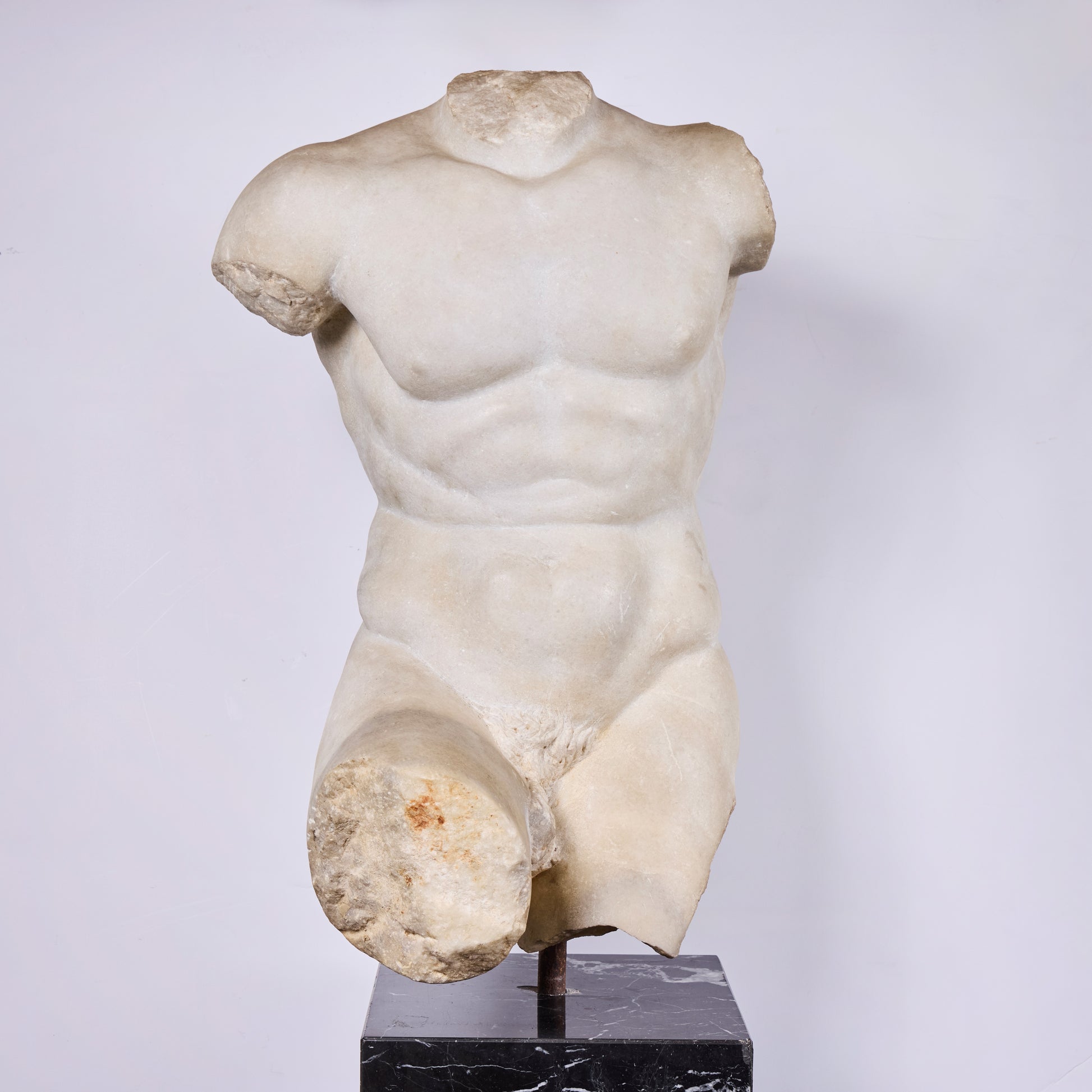 A powerful, late 17th-century, Italian marble torso of a male, hand-carved in Carrara marble, long celebrated for producing the finest sculptural marble in Europe. This fragment captures the enduring classical ideal through its anatomical clarity.
