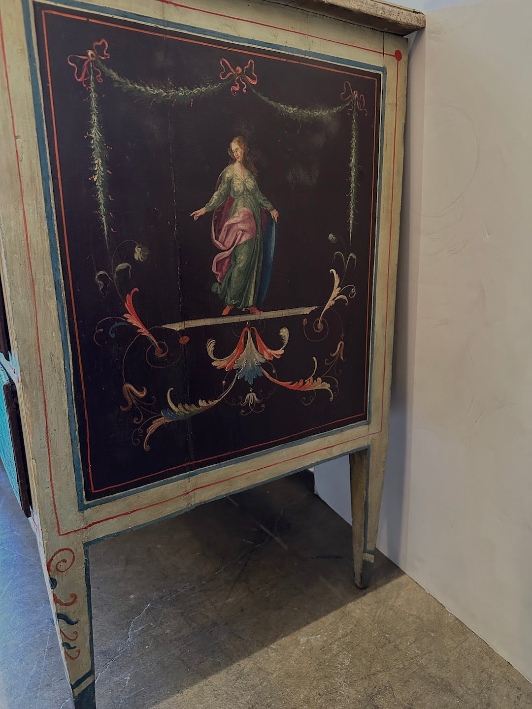 Crafted from wood and meticulously hand-painted, this antique Italian commode offers both decorative appeal and functional storage. With its historical character and timeless palette, it makes a statement in refined interiors—from traditional settings to eclectic European-inspired spaces. A standout piece for collectors of 18th century Italian furniture, or those seeking a distinctive focal point steeped in classical charm.
