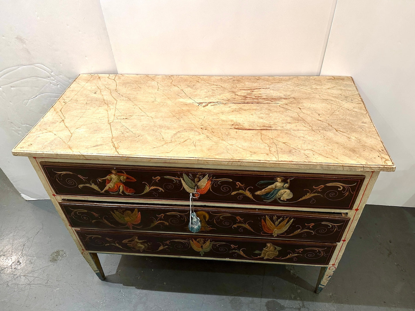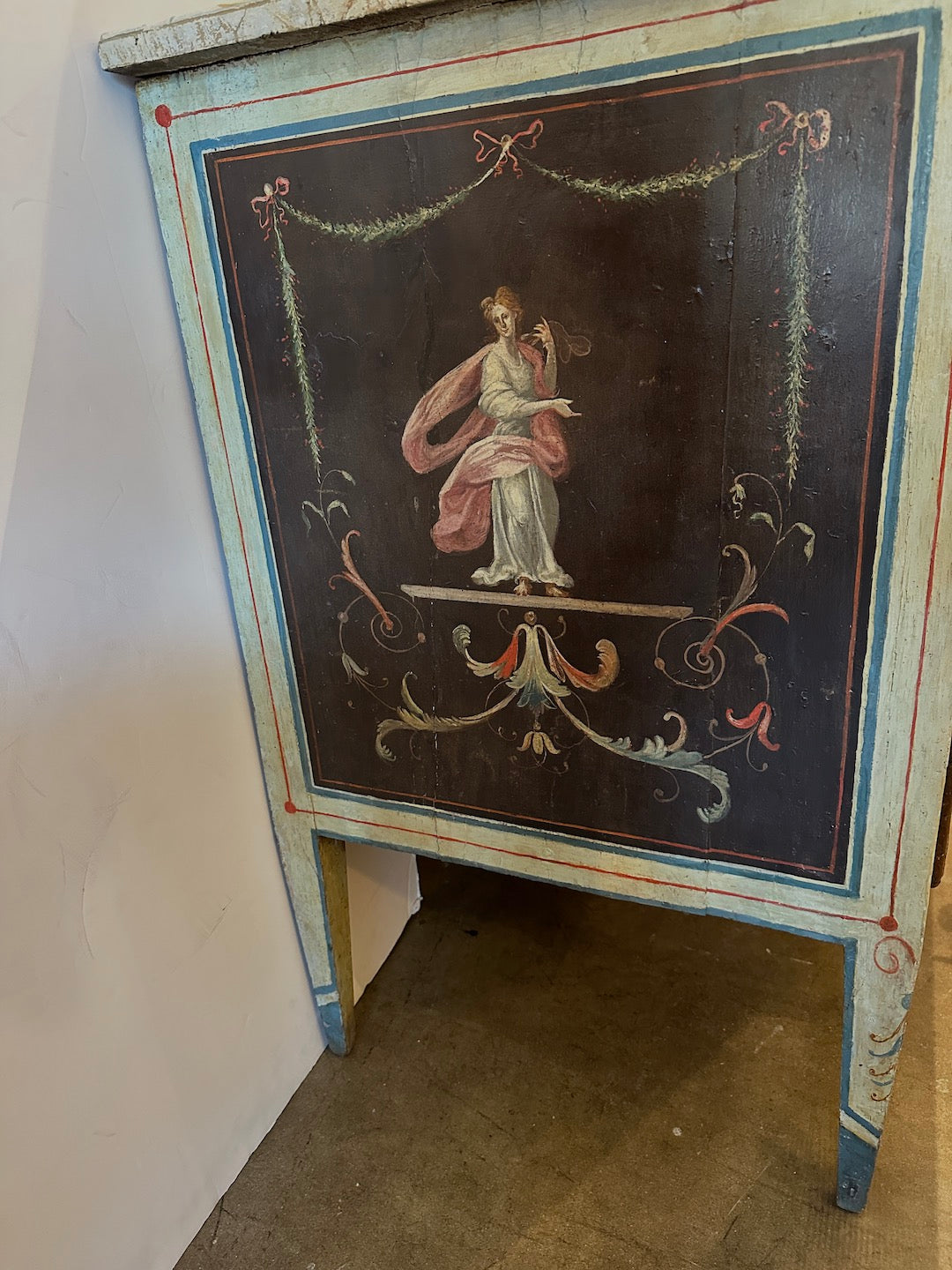 This exquisite Neoclassical hand-painted commode from 18th century Italy features beautifully rendered classical figures amidst scrolling foliage and botanical motifs. The façade is richly detailed with ornamental flourishes that showcase the artistry of period furniture, while the faux marble painted top adds a refined architectural element. The overall form exemplifies the balanced proportions and elegant symmetry typical of Italian neoclassical design.