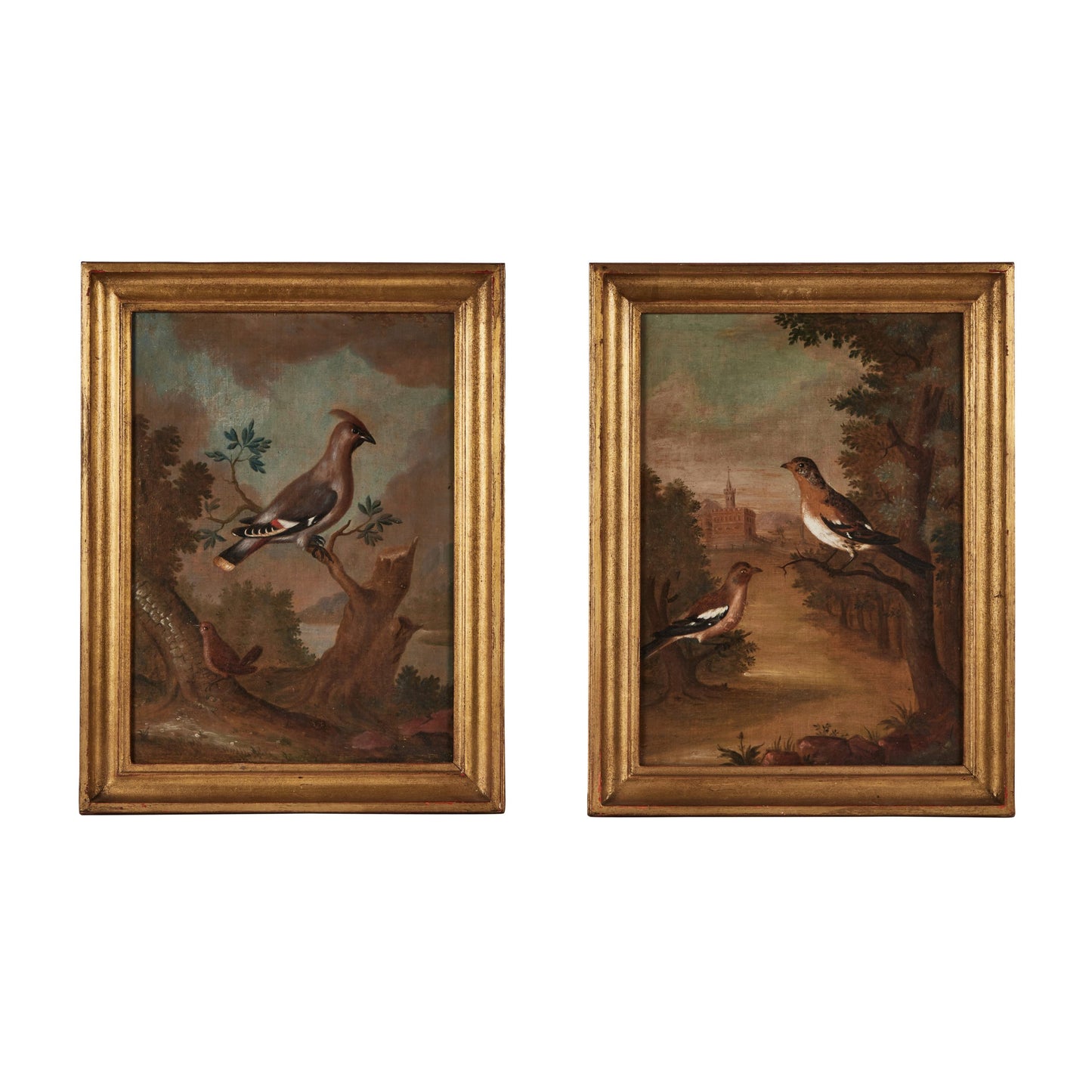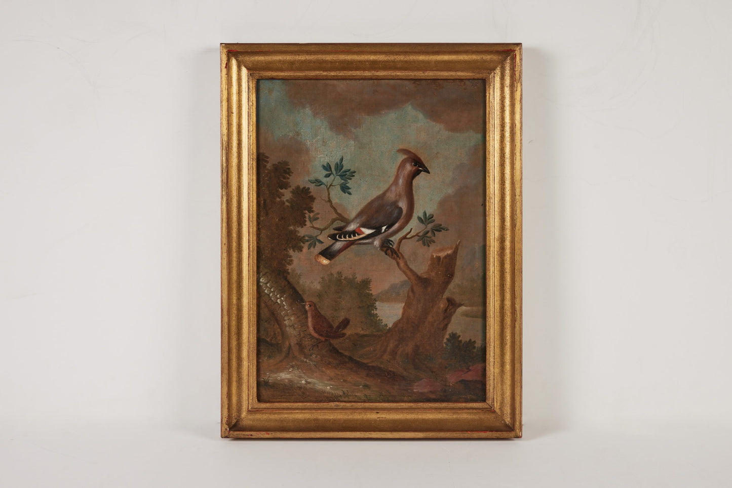 This moody pair of 18th century avian oil paintings captures birds nestled within lush, romanticized Italian landscapes. Rendered in rich, atmospheric tones, each canvas conveys a sense of quiet elegance and natural wonder—hallmarks of the Baroque and Rococo periods. The compositions emphasize both the avian subjects and the surrounding flora, offering timeless visual depth and classical artistry. The frames are later additions, chosen to complement the works without overshadowing their original character.
