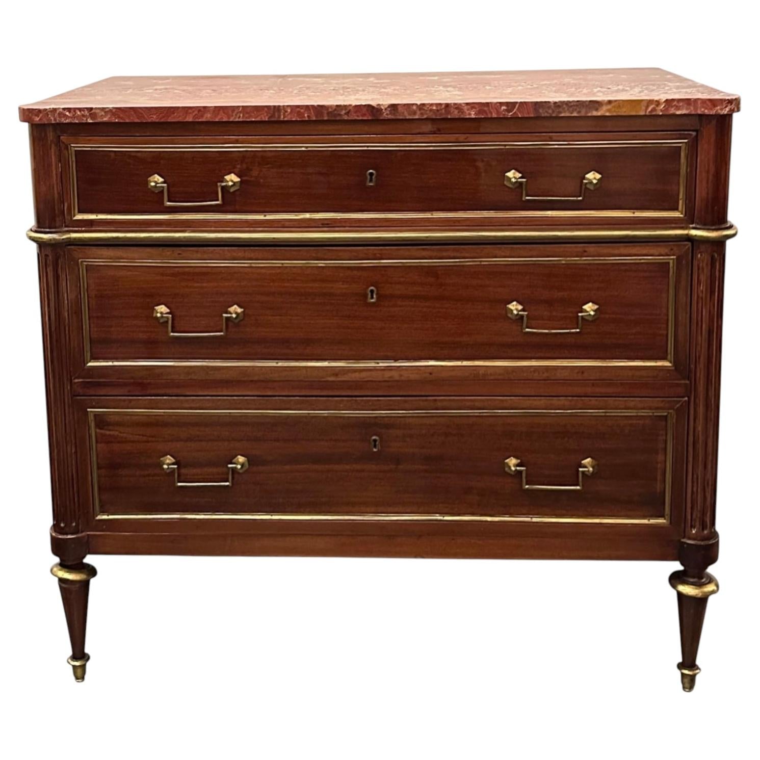 A refined late 19th century Italian walnut veneered chest, featuring three spacious drawers adorned with gilded metal handles and topped with luxurious, veined marble slab. These elegant chest combines rich, warm-toned wood grain with the opulence of gilt-wood trim and classical hardware, creating a timeless neoclassical appeal.