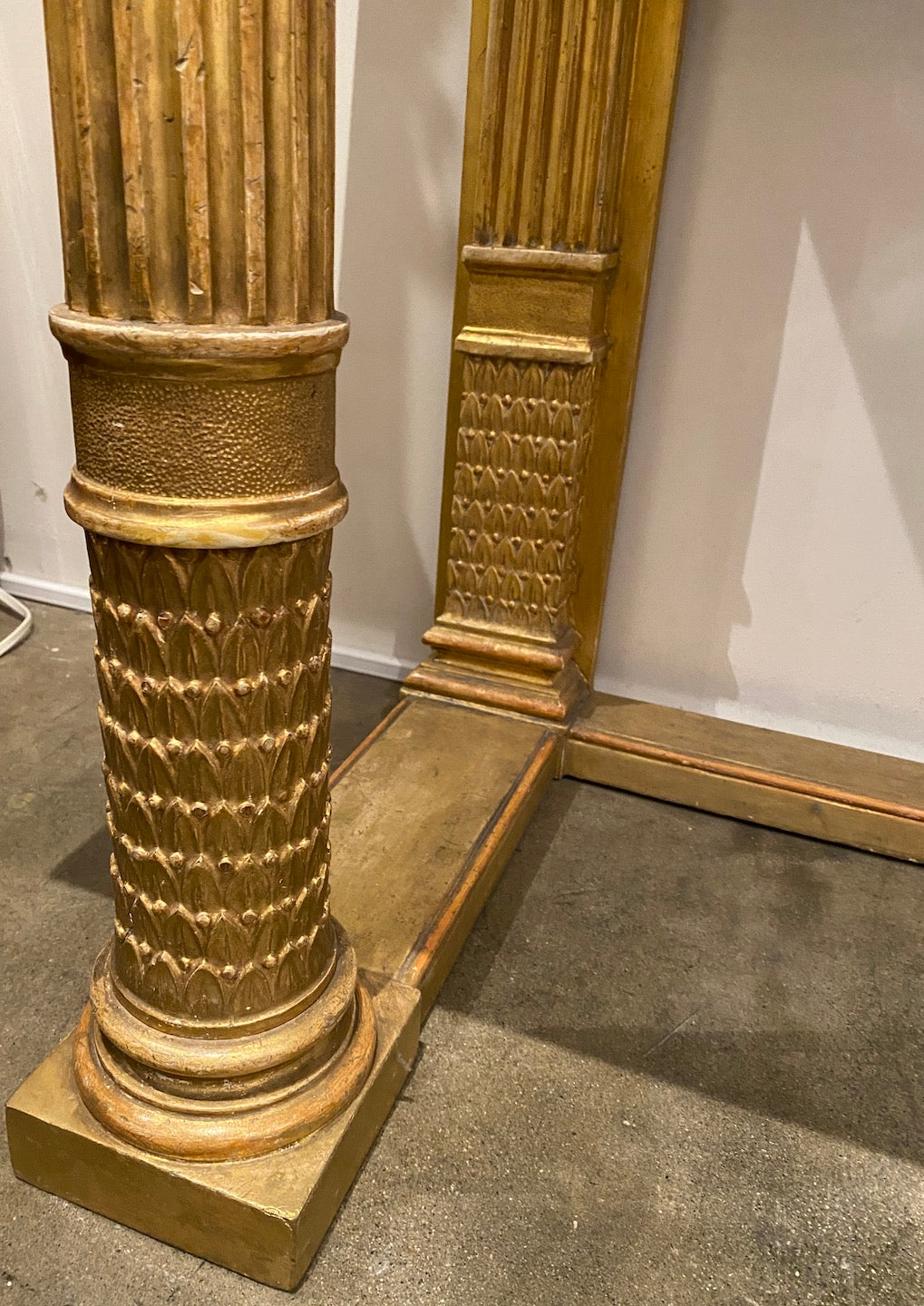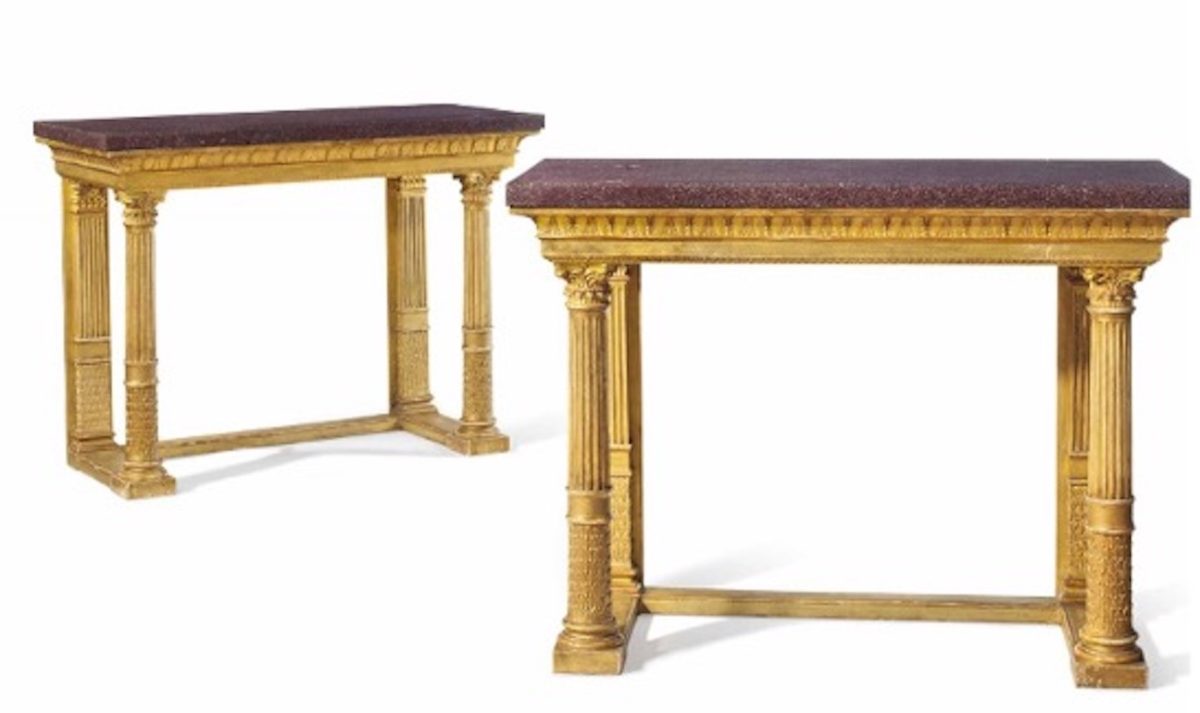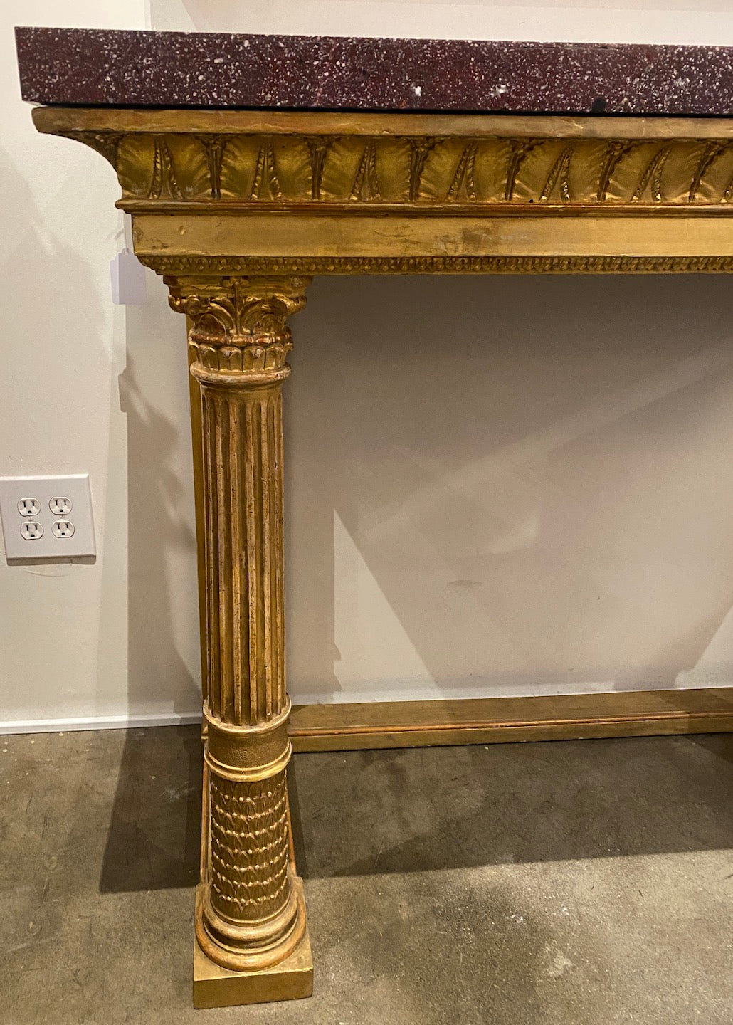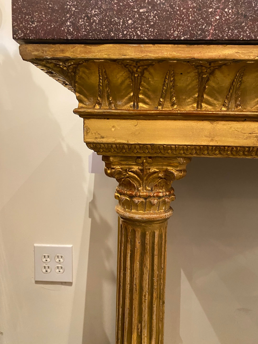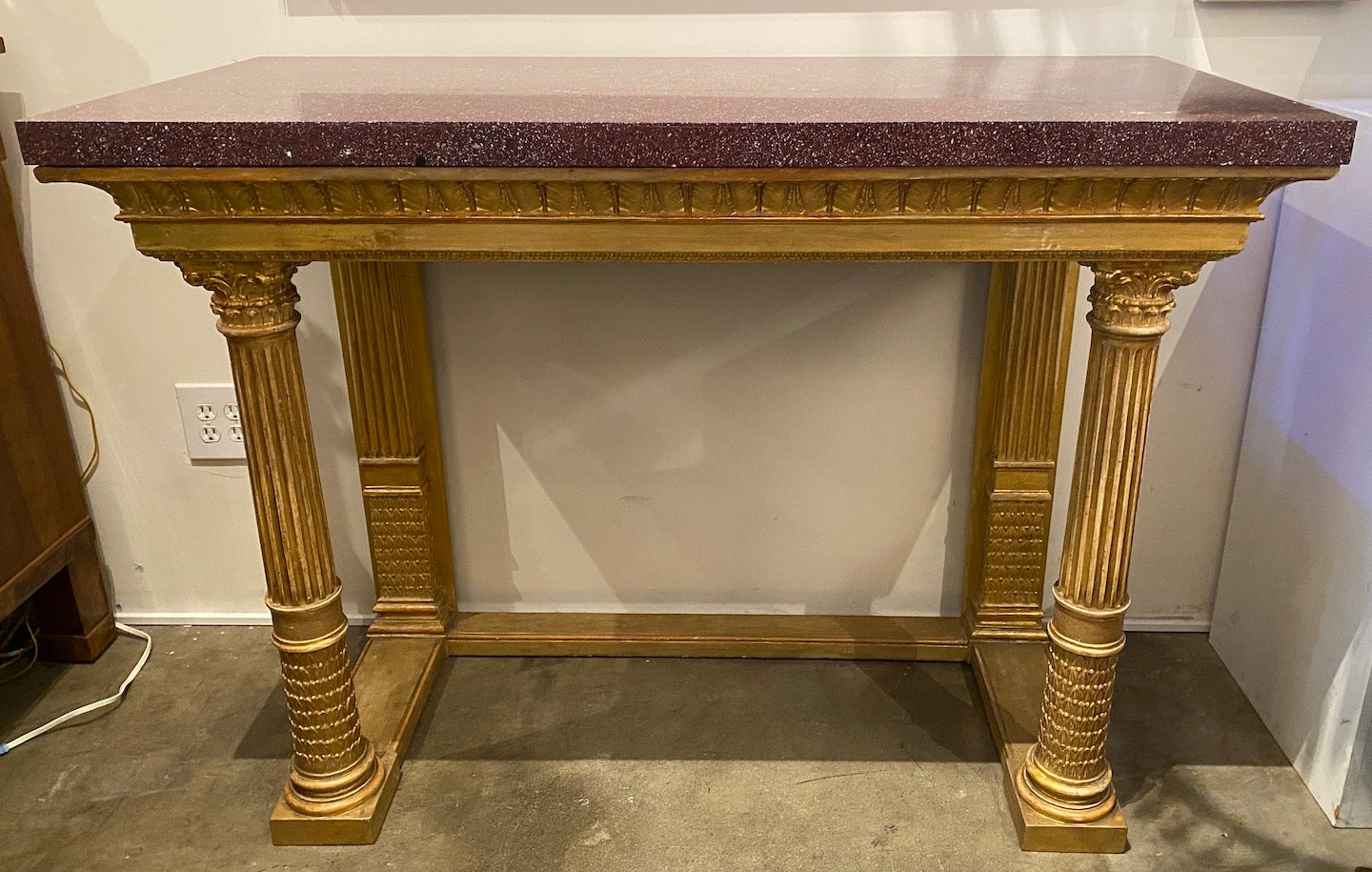 This exquisite pair of Florentine gilt wood console tables dates to circa 1830 and showcases the height of Italian neoclassical artistry. Each piece is finely hand-carved and finished in rich gilt, with porphyry veneered tops—a material long associated with imperial grandeur. The architectural bases feature tiered plinths and elegant fluted Corinthian columns, echoing the classical influences of the era.