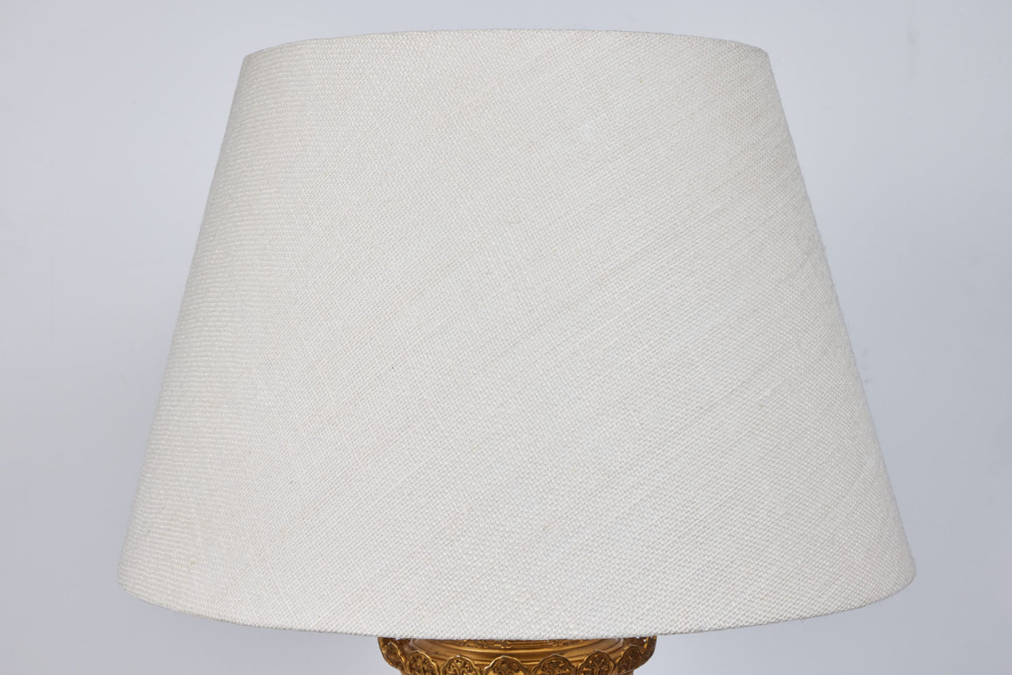 Topped with custom 20" diameter heavy linen shades, these lamps offer a dramatic blend of Eastern and Western design influences. A true collector’s pair, ideal for anchoring a space with historical depth and refined elegance. Vases 8" diameter.