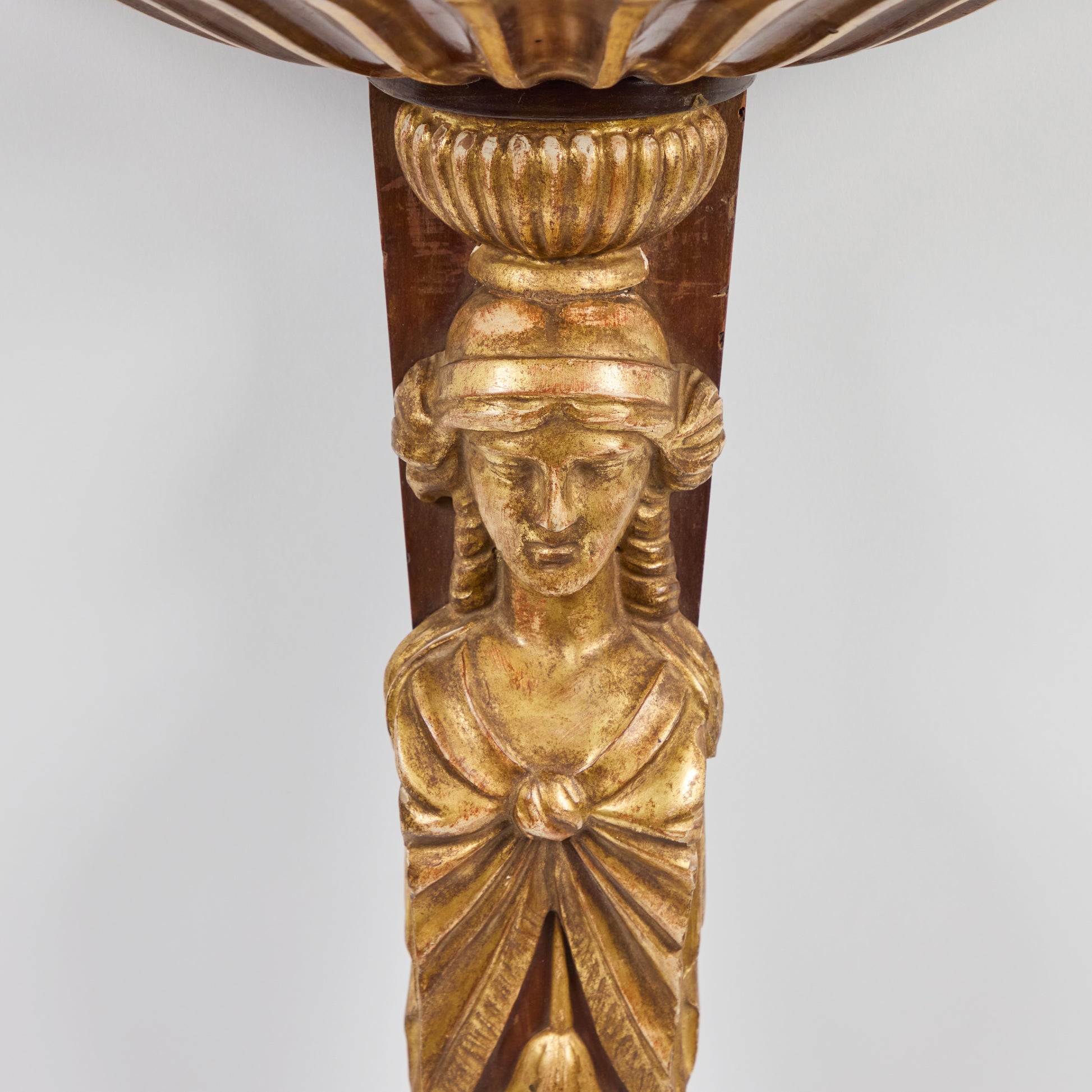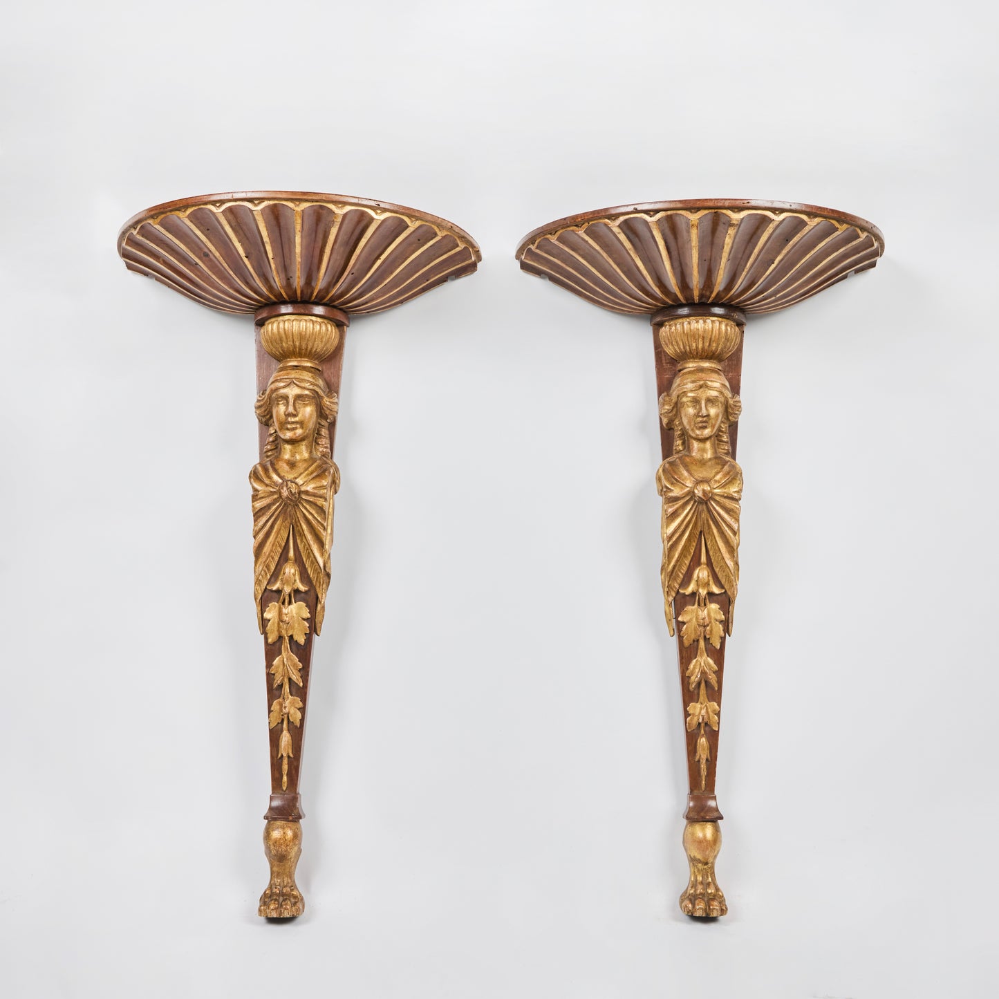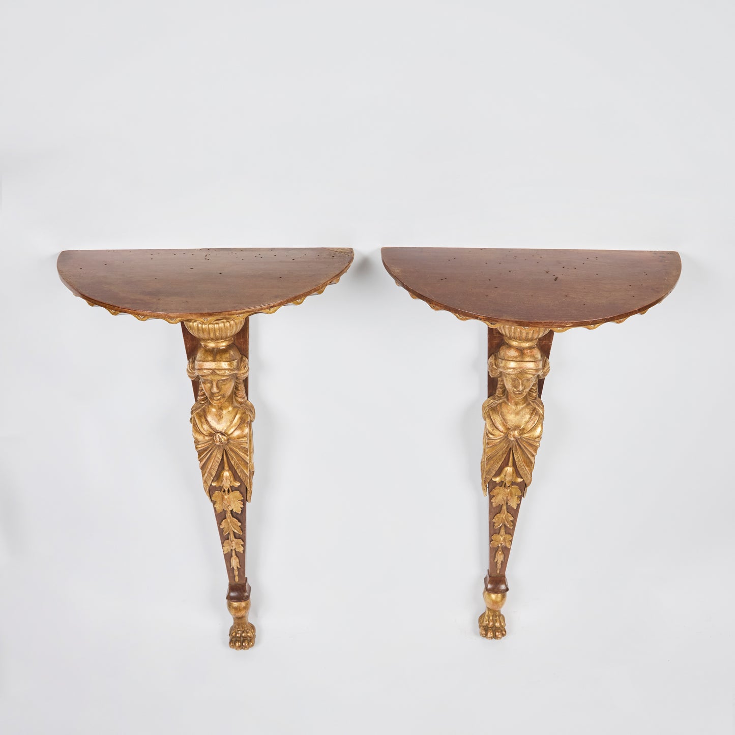 Add sculptural elegance and classical grandeur to your interiors with this pair of circa 1880 Italian wall brackets, meticulously hand-carved from walnut and adorned with parcel gilt detailing. Featuring figural motifs, these ornamental wall sconces are rich in character and artistry, making them striking display pieces for statues, vases, or decorative objects.