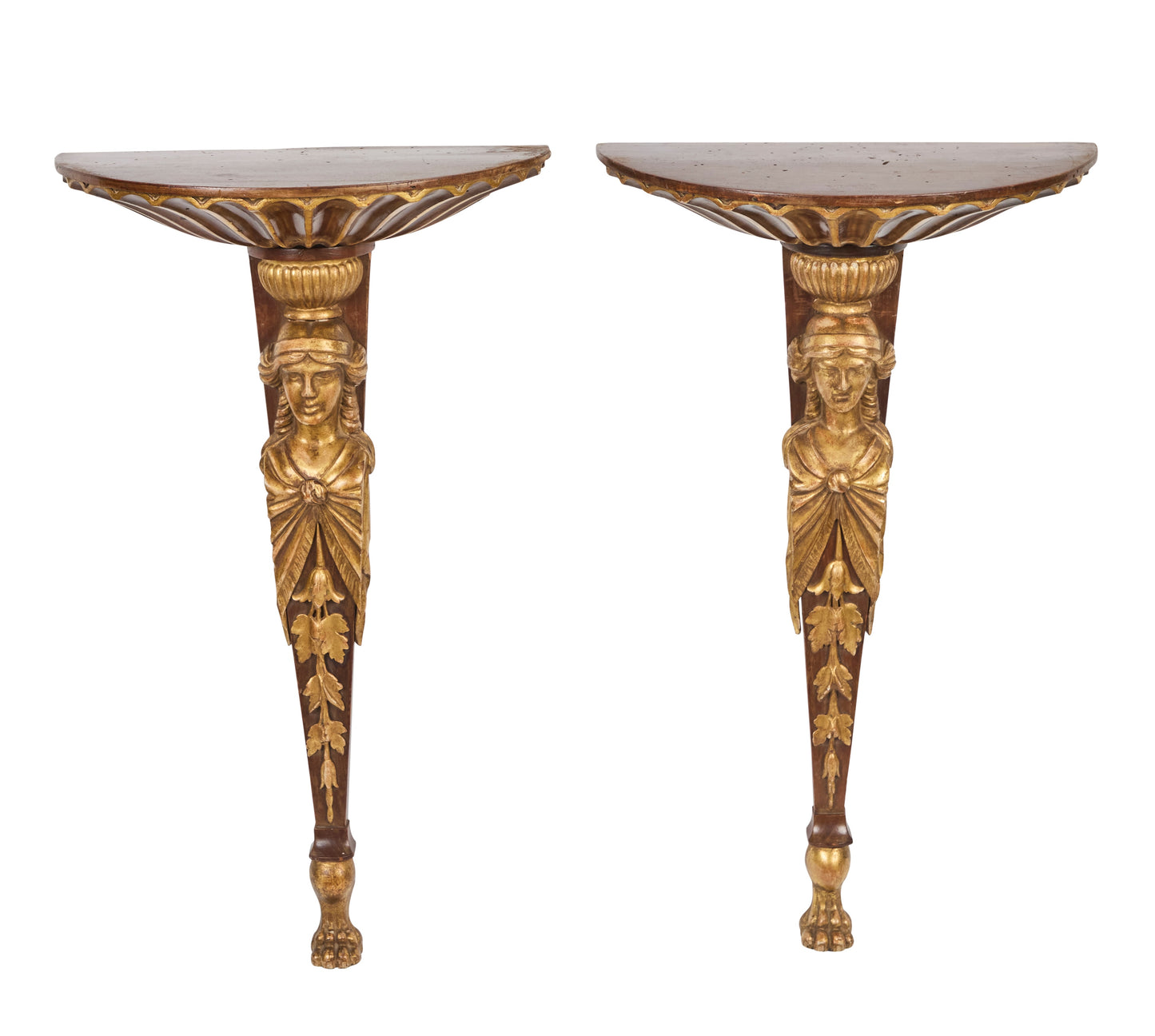 Circa 1880 Pair of Italian Walnut & Parcel Gilt Wall Brackets – Hand-Carved Figural Console Sconces