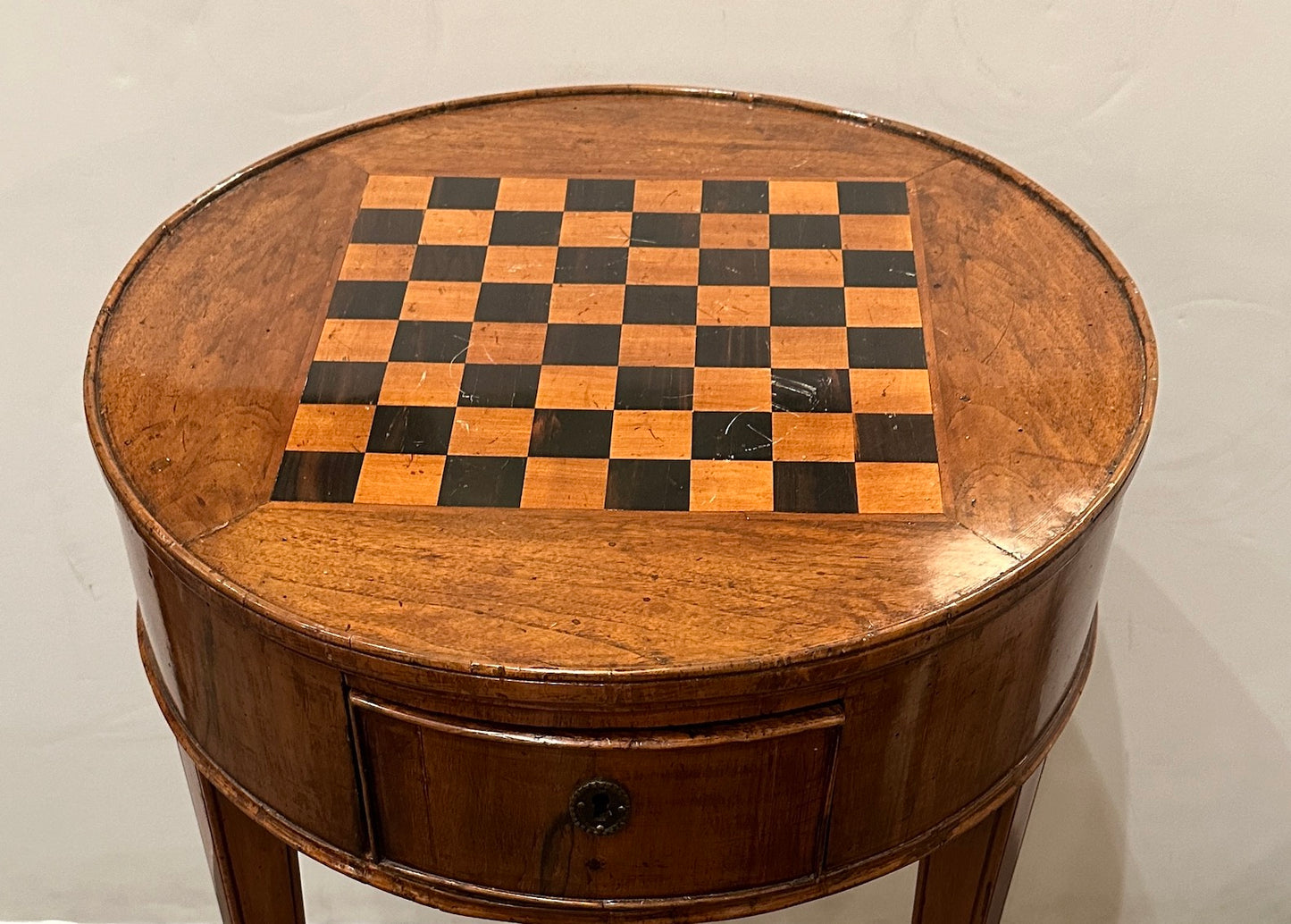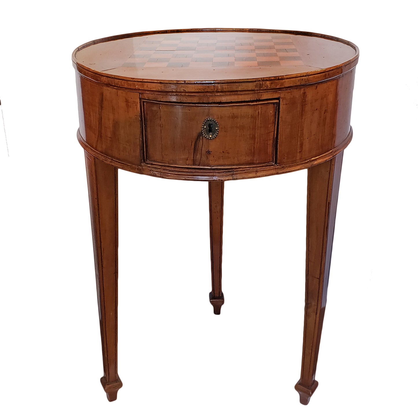 An elegant example of 18th-century French craftsmanship, this Louis XVI games table features a circular parquetry top designed for chess or checkers play. The intricate inlaid pattern showcases the refined artistry of walnut and ebonized wood, offering both function and visual appeal. A discreet single drawer provides storage for game pieces, marrying form and practicality.