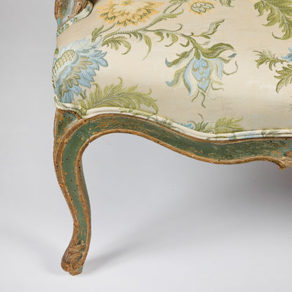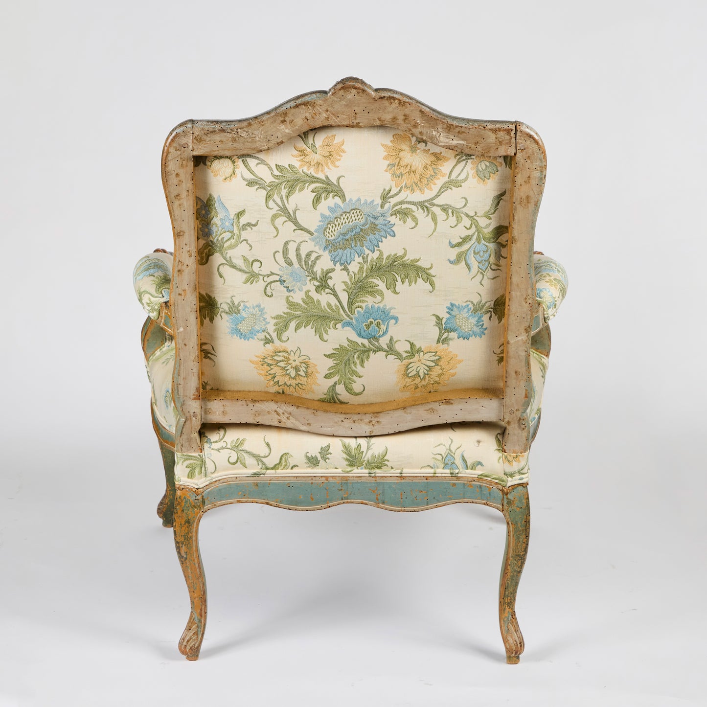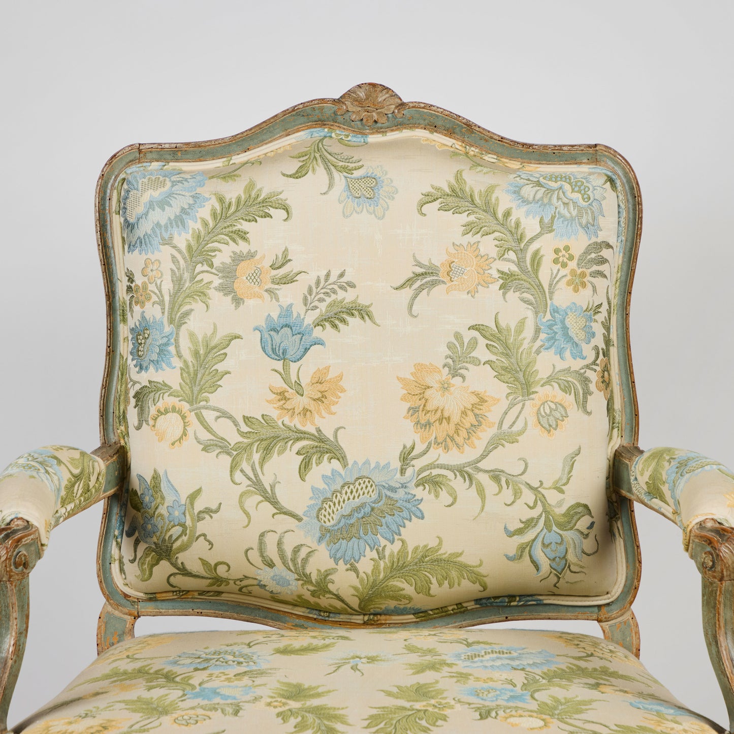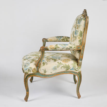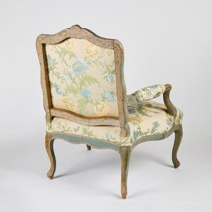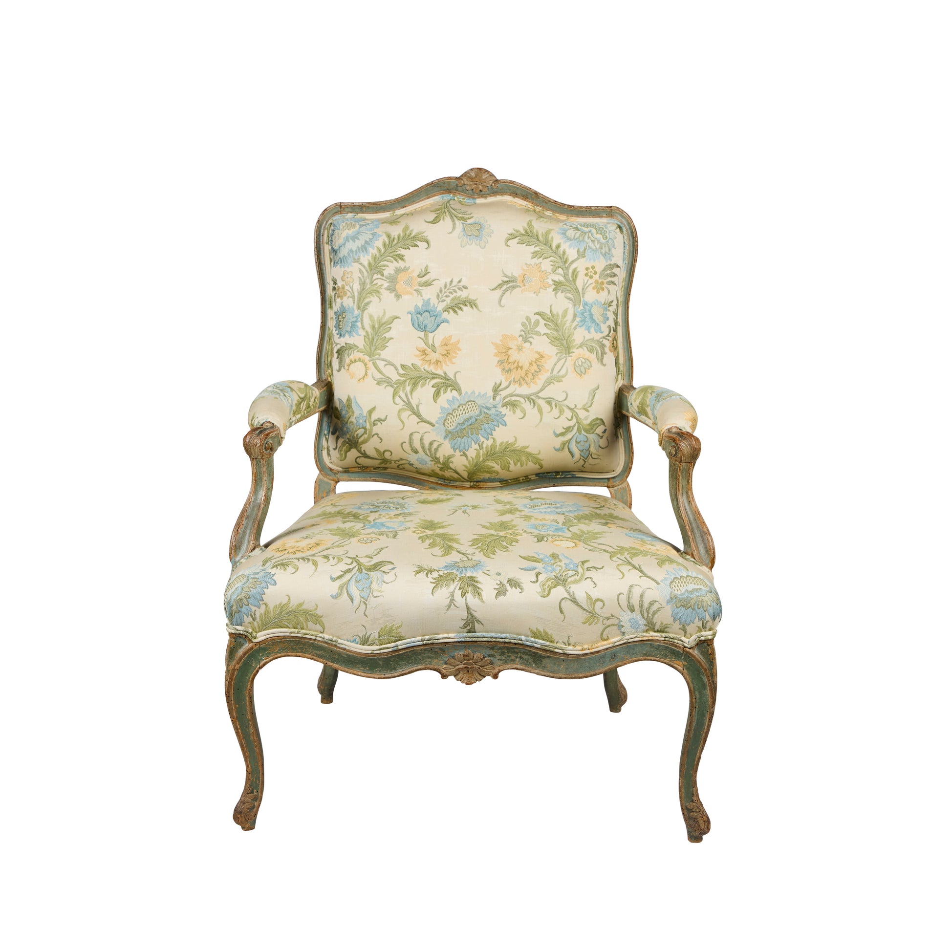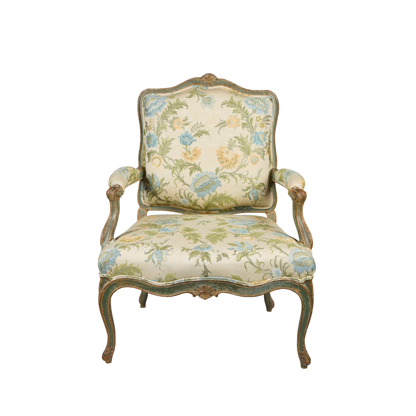 18th Century Louis XV Painted Armchair – Hand-Carved French Fauteuil with Italian Coraggio Upholstery