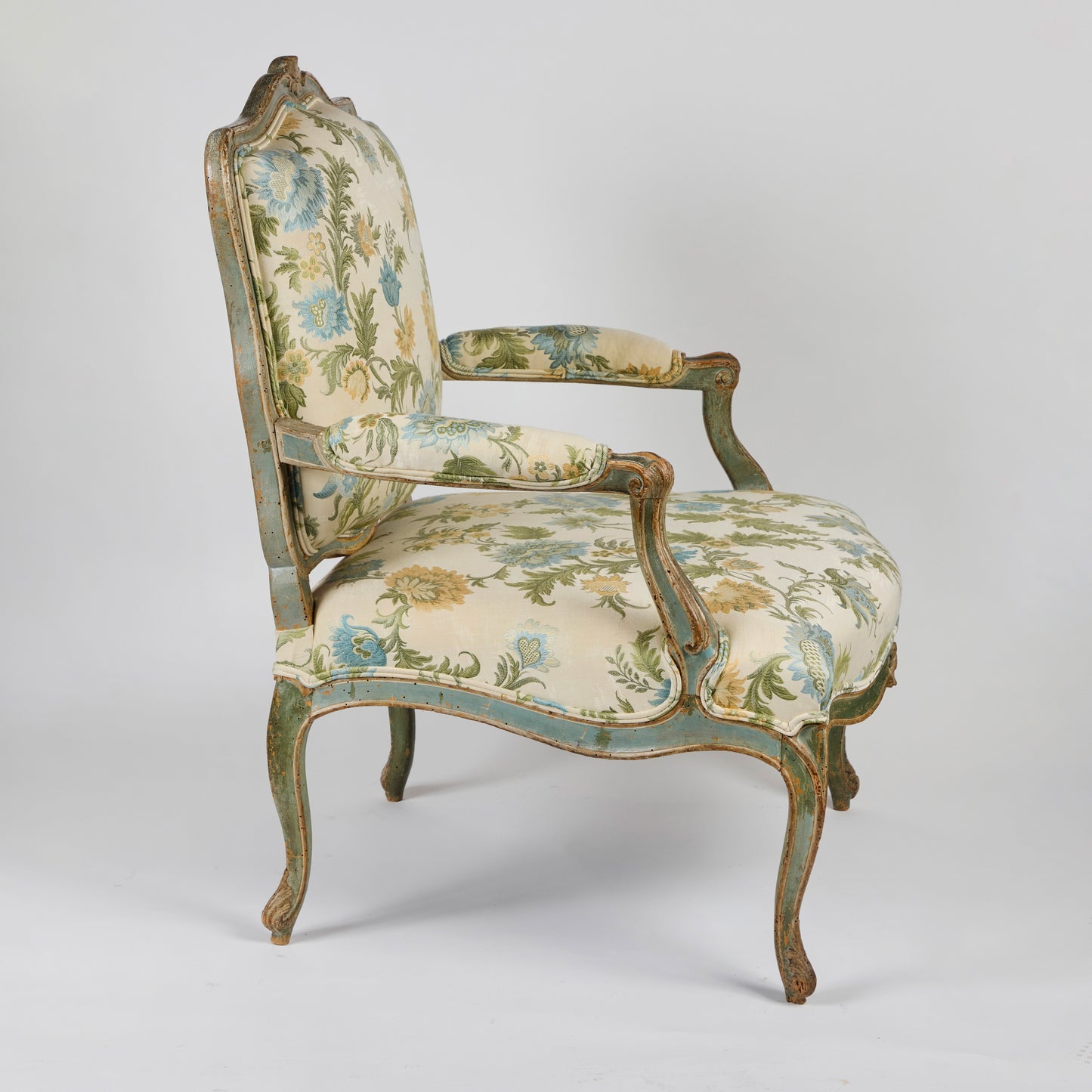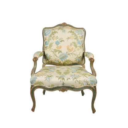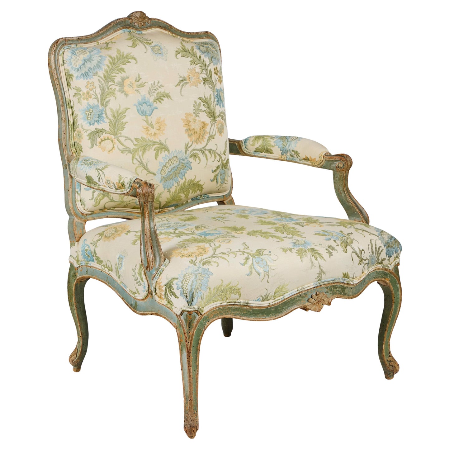 This exquisite period Louis XV armchair from 18th century France showcases the elegance and craftsmanship synonymous with authentic French Rococo design. Hand-carved from wood and hand-painted in a soft green finish, this graceful fauteuil features the iconic cabriole legs, scrolled arms, and serpentine lines of the Louis XV era.