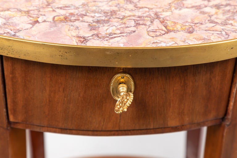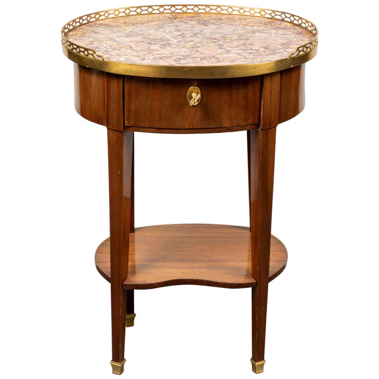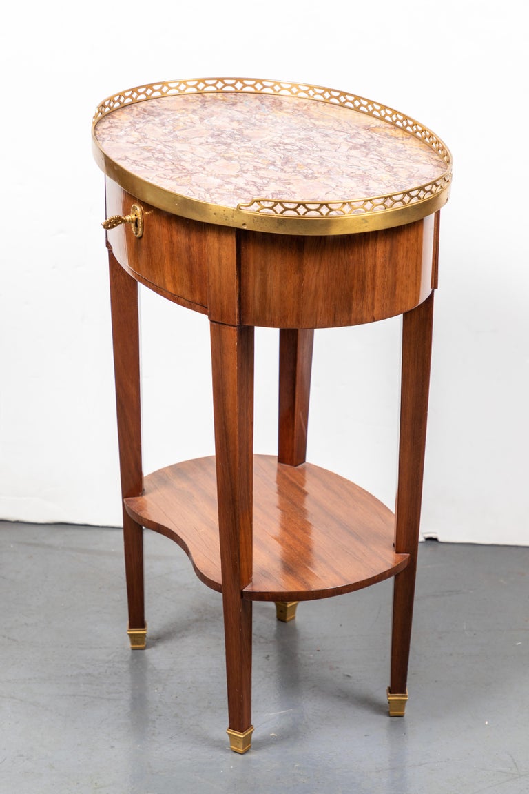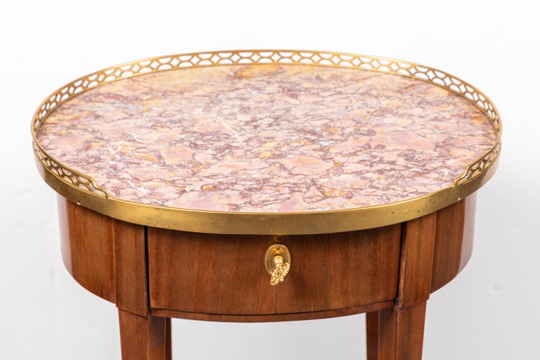 This elegant French oval side table from circa 1900 exemplifies Belle Époque refinement, featuring a single-drawer veneered body raised on tapered legs with ormolu feet. The oval rouge marble top is inset and bordered by a finely cast, pierced bronze gallery, adding both function and decorative delicacy.