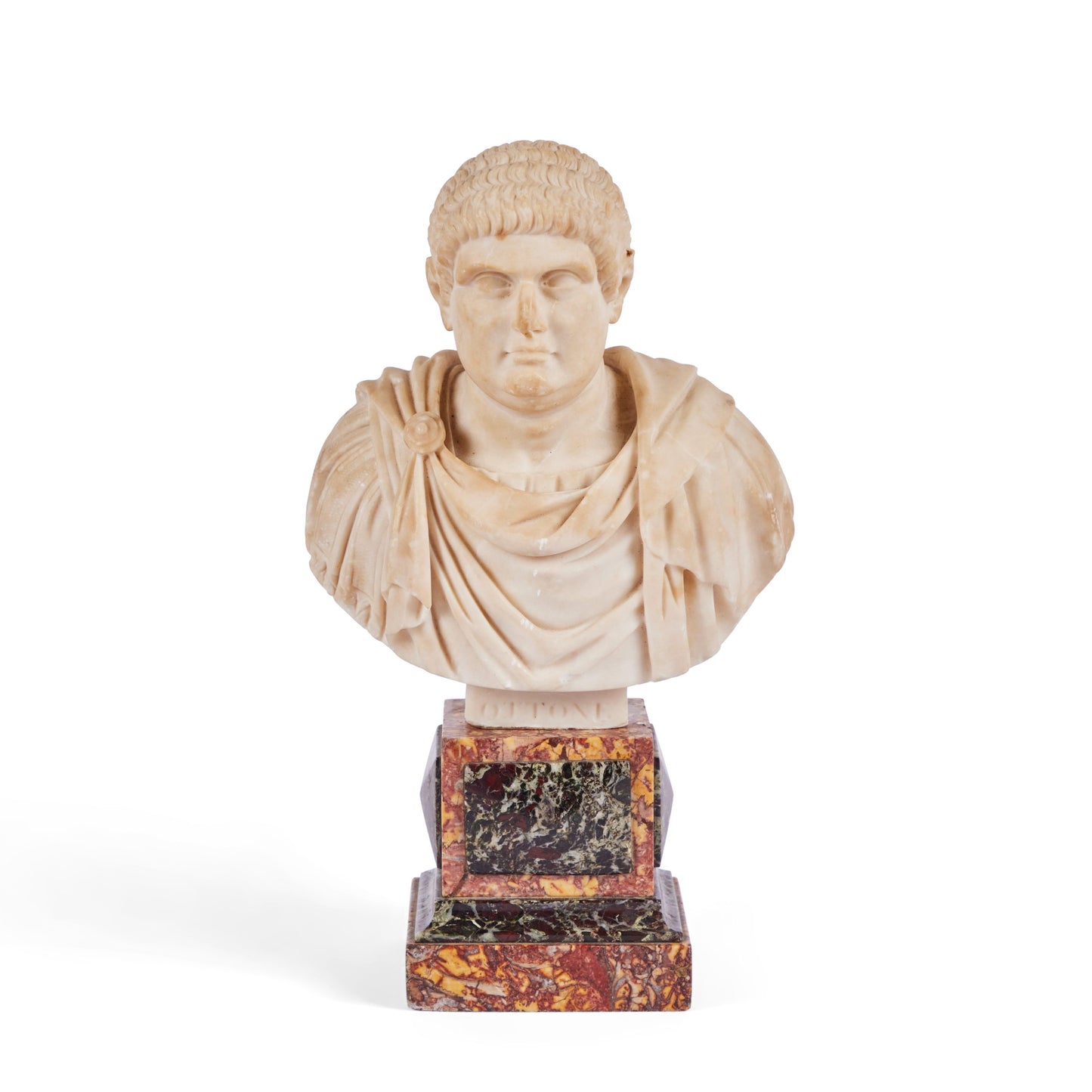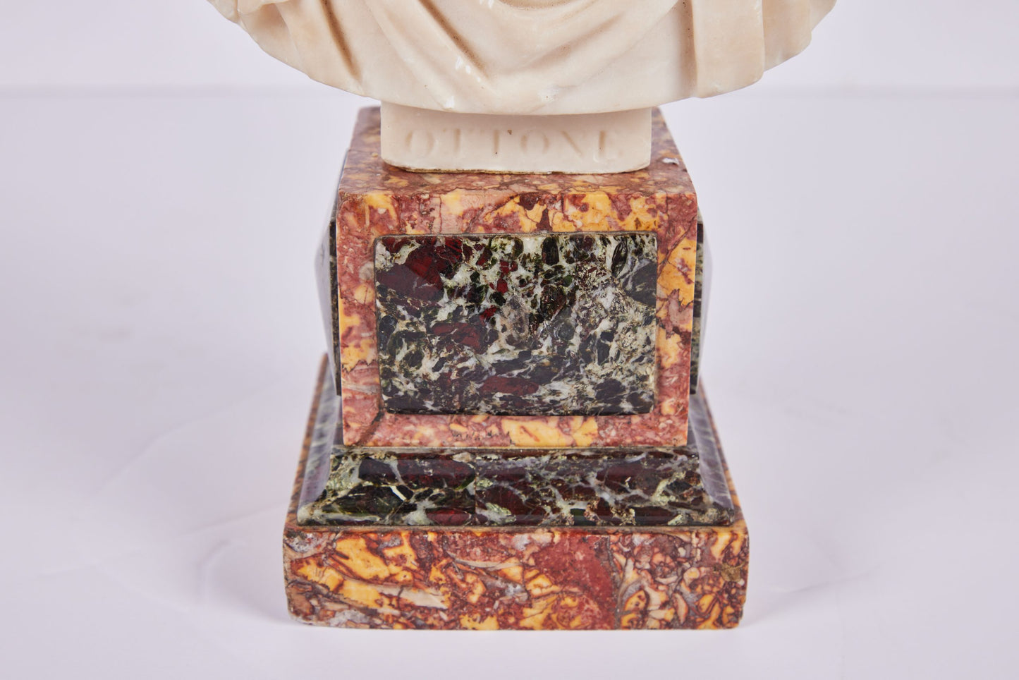 An elegant, hand-carved 18th century Carrara marble bust likely depicting a Holy Roman Emperor, mounted on an original specimen marble base of the same period. The piece is inscribed “OTTONI,” referencing one of the Ottonian rulers, evoking the grandeur of early imperial Europe. The figure is rendered with a strong, solemn expression and flowing drapery, emphasizing the sculptor’s classical training and the influence of ancient Roman portraiture.