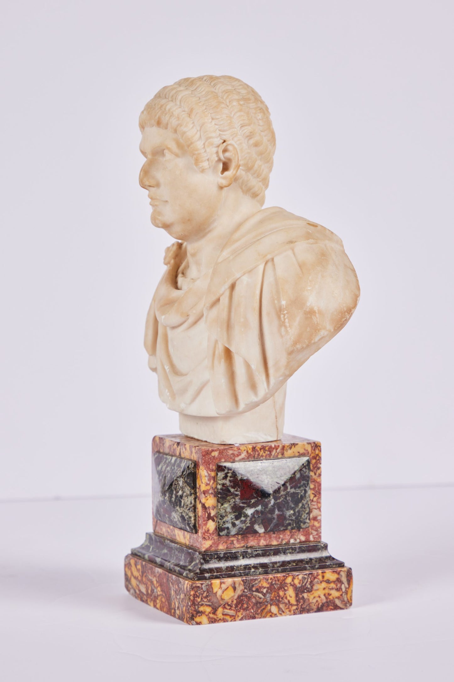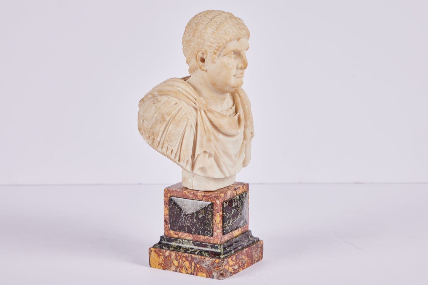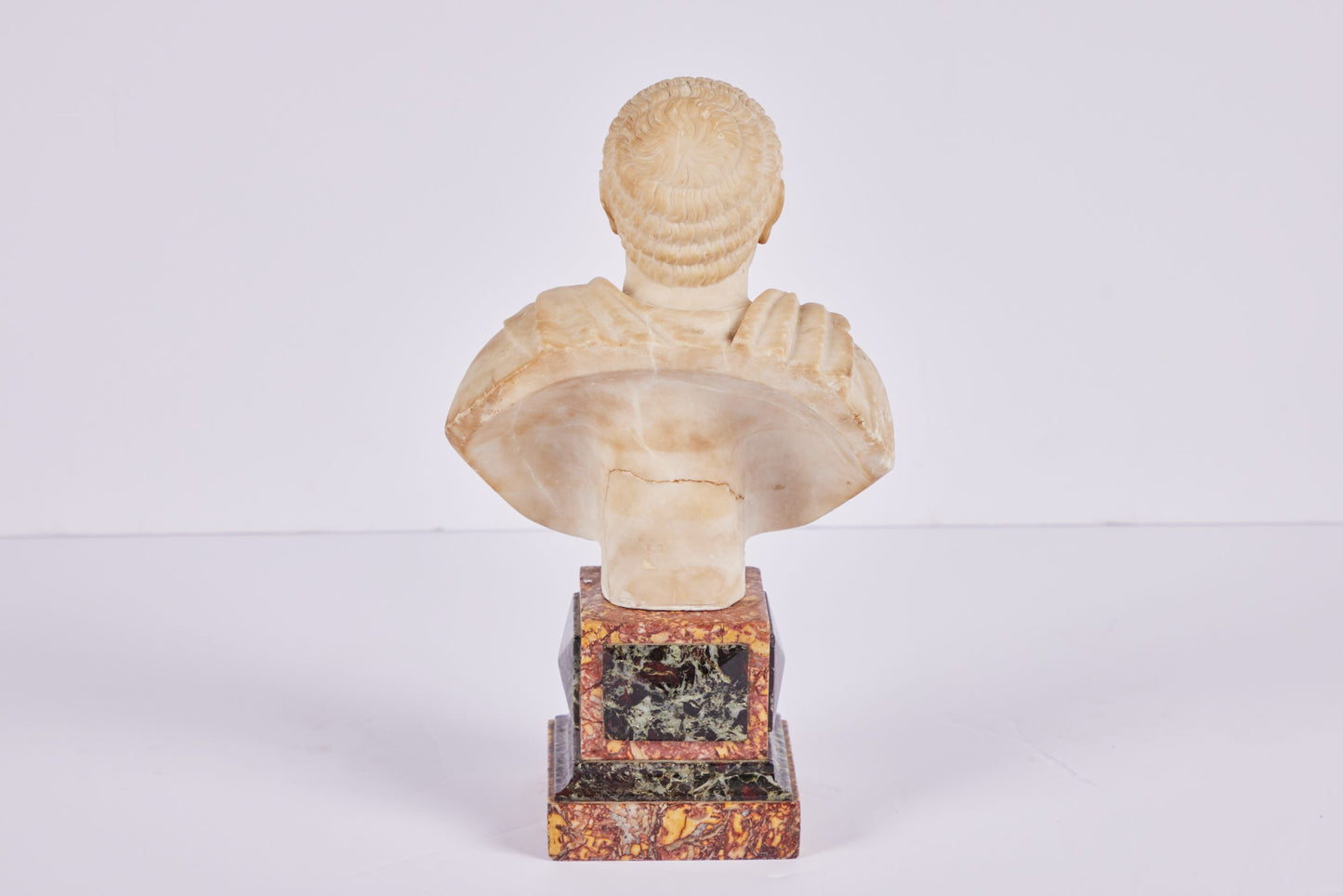 This petite marble bust is ideal for collectors of neoclassical or Grand Tour objects, offering refined craftsmanship in a compact scale. Its historic resonance, paired with the quality of the marble and the aged patina, make it a distinguished focal point in a curated interior or academic setting.