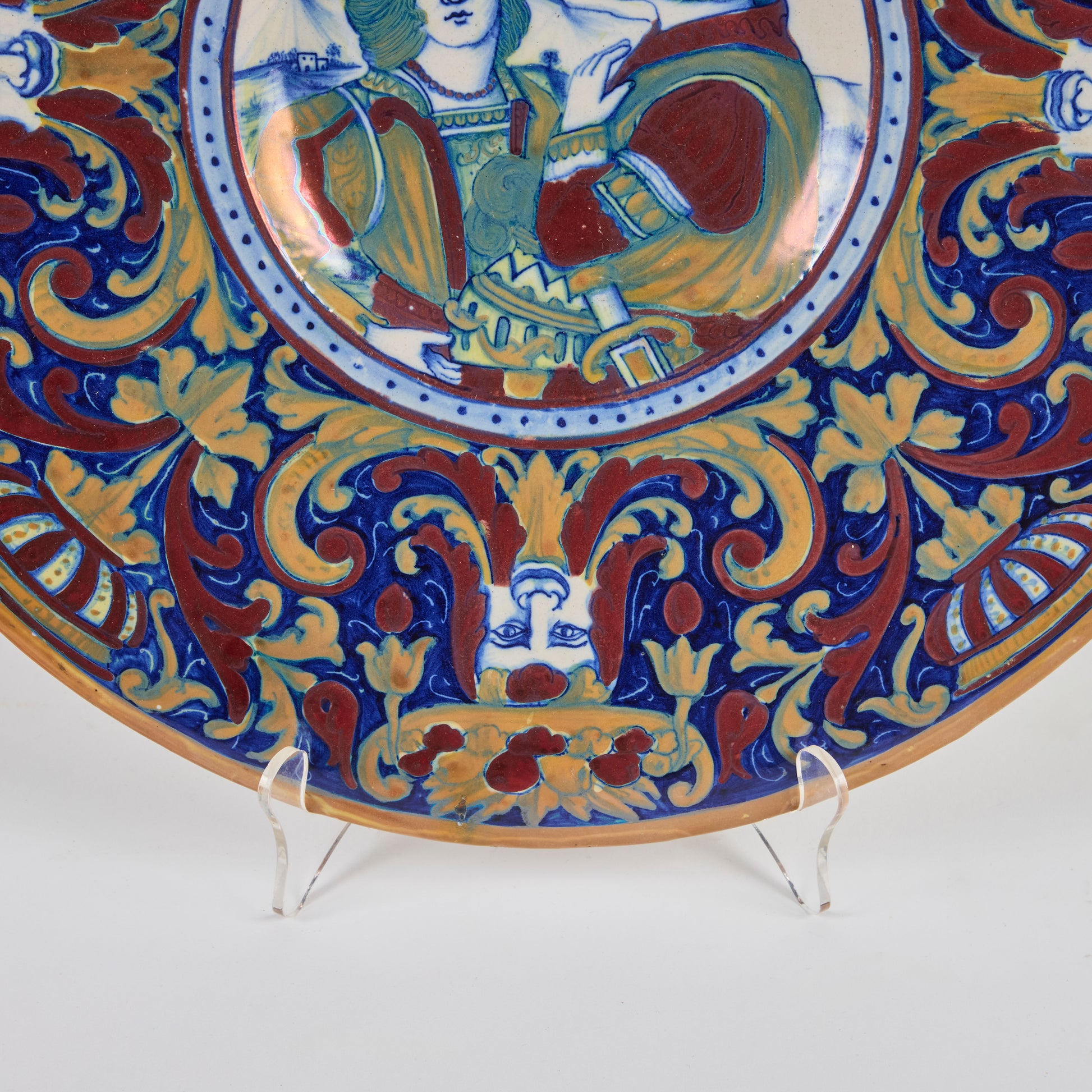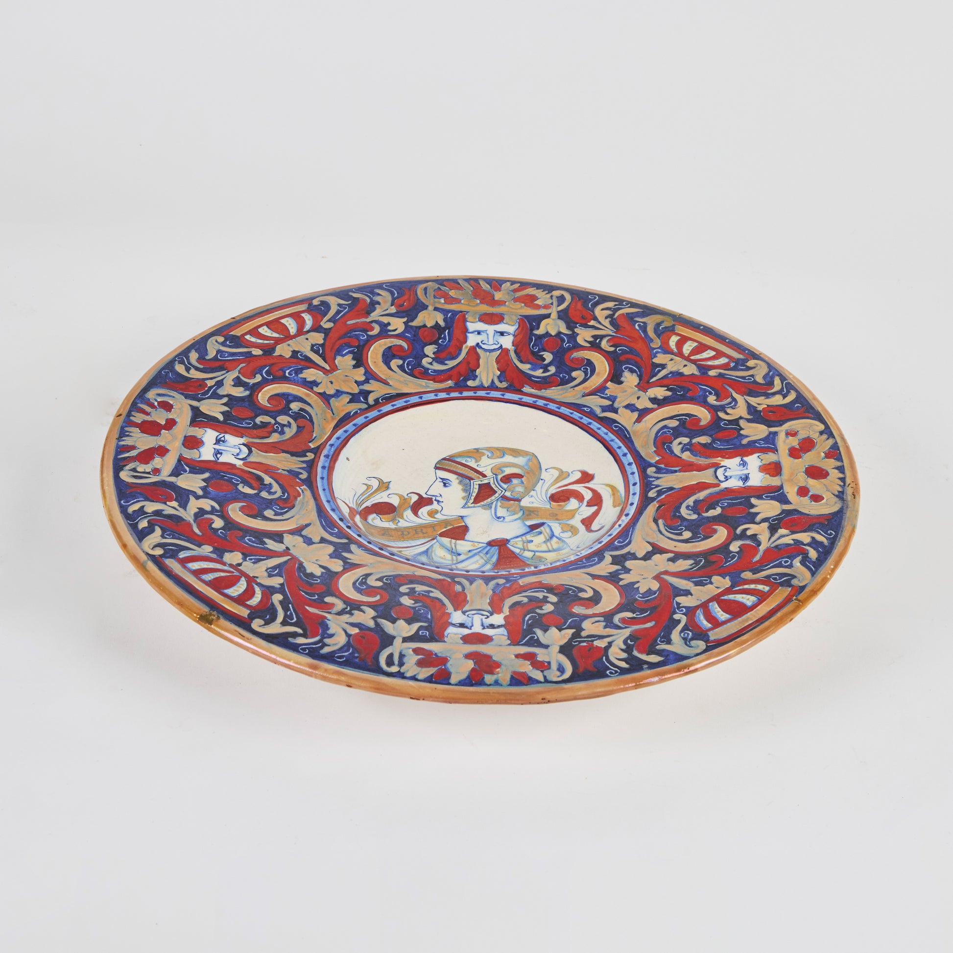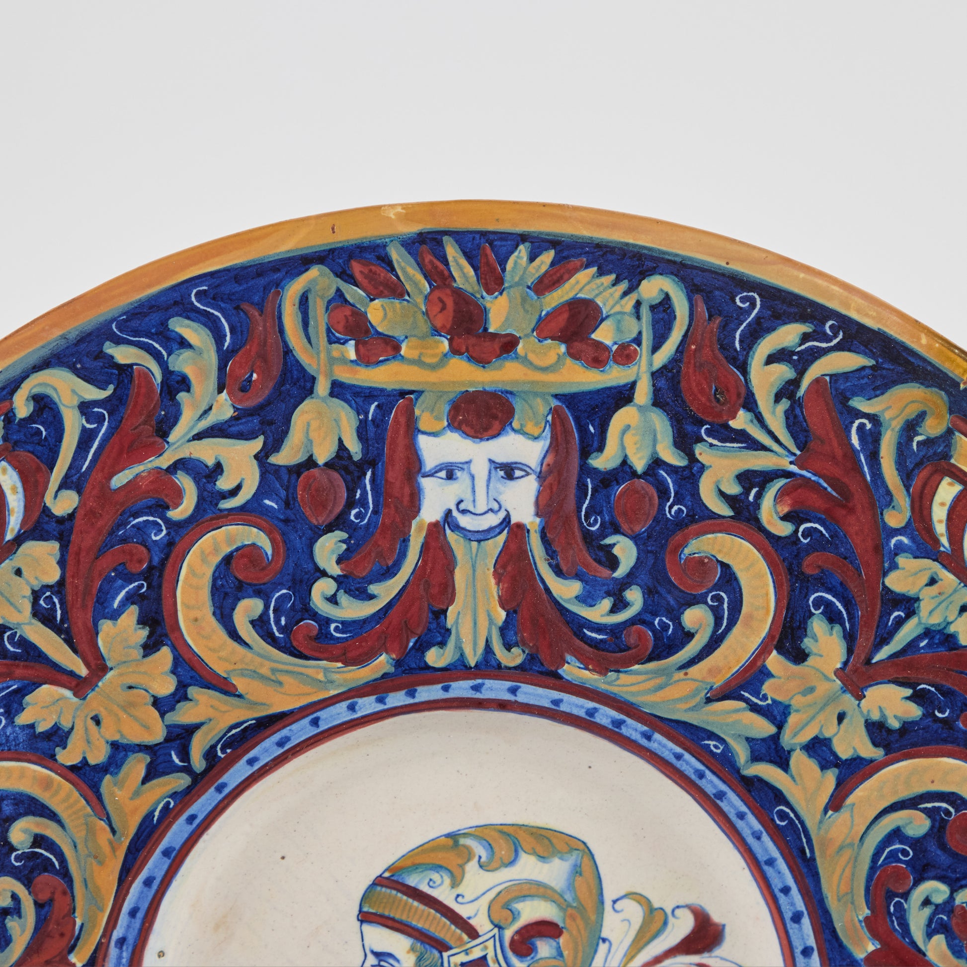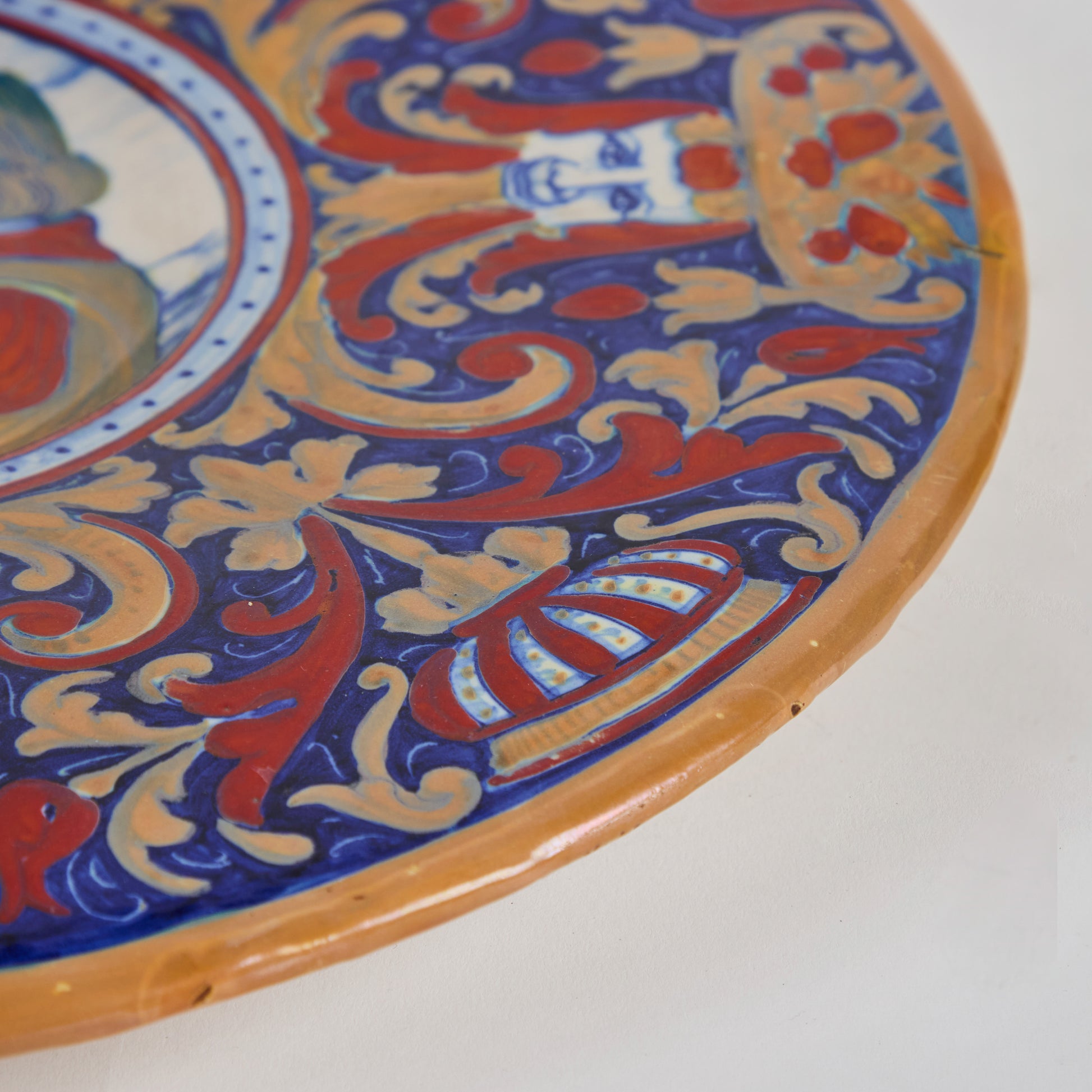 Each tin-glazed platter showcases a beautifully glazed surface with vivid pigments that remain strikingly fresh, making them ideal as decorative wall plates, tabletop centerpieces, or part of a Mediterranean-inspired kitchen or dining display.