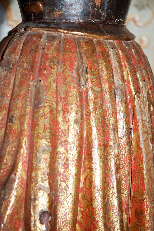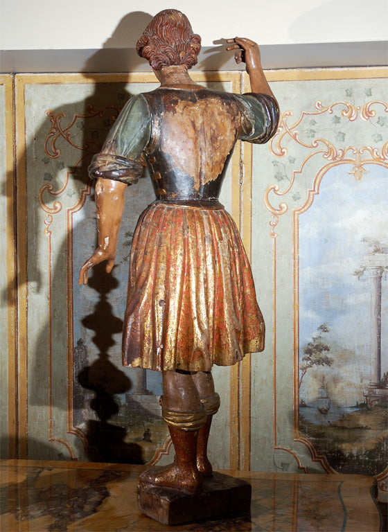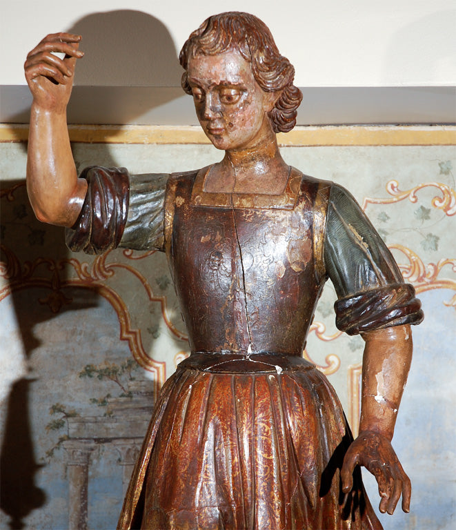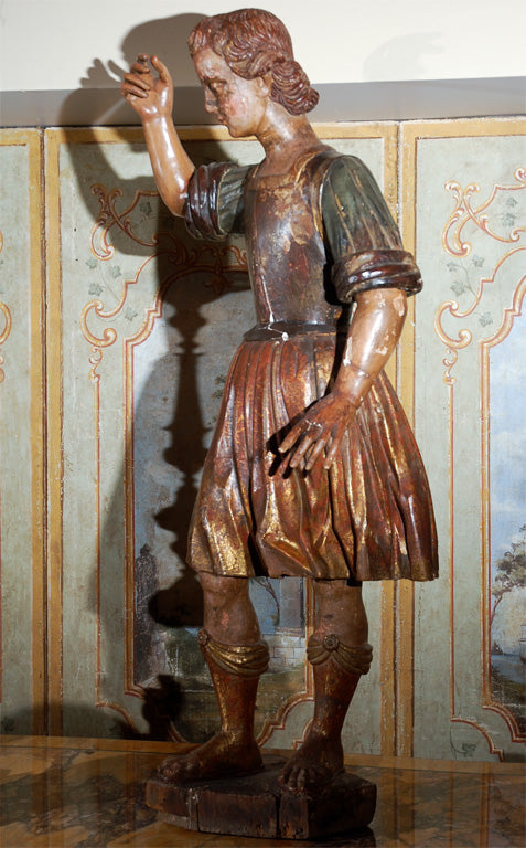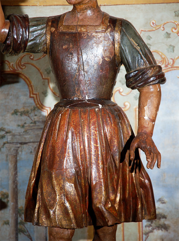 This exquisite Venetian wood statue of St. George dates to the late 1700s and showcases the artistry of Italian religious sculpture at its finest. Hand-carved with remarkable precision, the figure is adorned in richly colored polychrome paint and embellished with delicate gilded lacework, lending a regal and sacred presence to the piece.